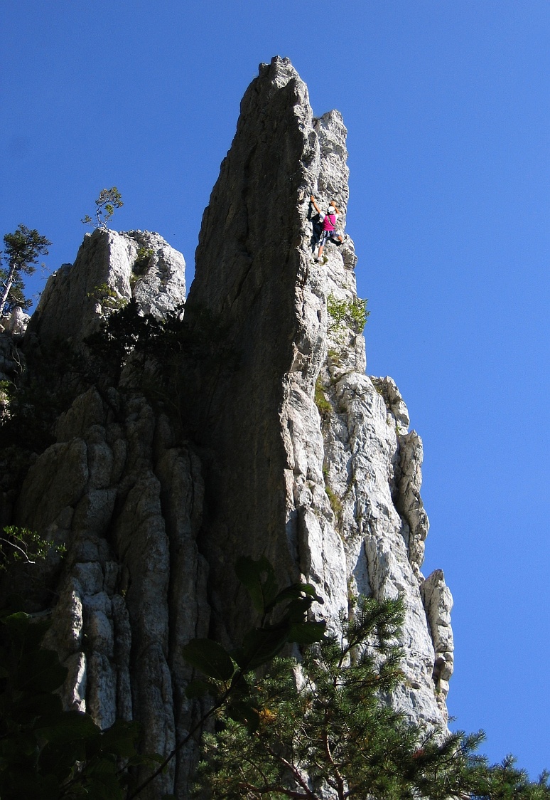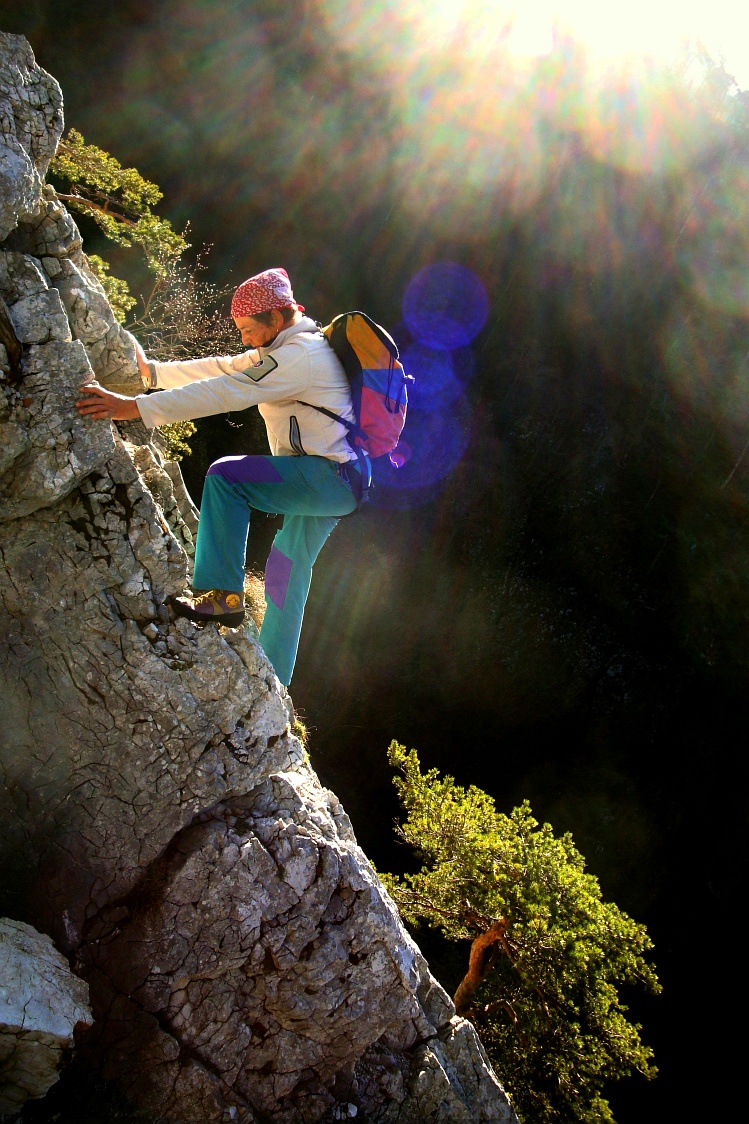 Pod skalami sa samotár prezuje do lezeckých topánok. V tých časoch to boli ešte tvrdé vibramky. Ako jedinú časť výzbroja si zavesí na pás karabínku. Lano so sebou nemá. Duševné napätie stúpa, nasleduje prvý krok do skaly, o niekoľko sekúnd bude možno už desať metrov nad zemou. Skala je studená, prsty mu krehnú. Ale po chvíli práce srdce zvýši svoje úsilie, krv začne divoko prúdiť v žilách a ohreje mu ruky. Kontakt so studenou horninou sa stane nielen znesiteľným, ale dokonca aj príjemným. Lezec cíti radosť z pohybu, každý krok nahor ho napĺňa dávkou šťastia a rozkoše. Každý jeho krok je istý, pozná slabosti skaly, ale aj svoje vlastné. Vie presne ohodnotiť, čo je z hľadiska jeho vlastnej bezpečnosti ešte akceptovateľné, kde je hranica, ktorú nesmie prekročiť. Vie, že jediná jeho cesta vedie nahor, zostúpiť po prekročení určitej výšky už nemôže. Ak by volal o pomoc, nik by ho nepočul. Na svoje výstupy sa dôkladne pripravil, jeho telo je vytrénované a so zvislou skalou v pravidelnom kontakte.