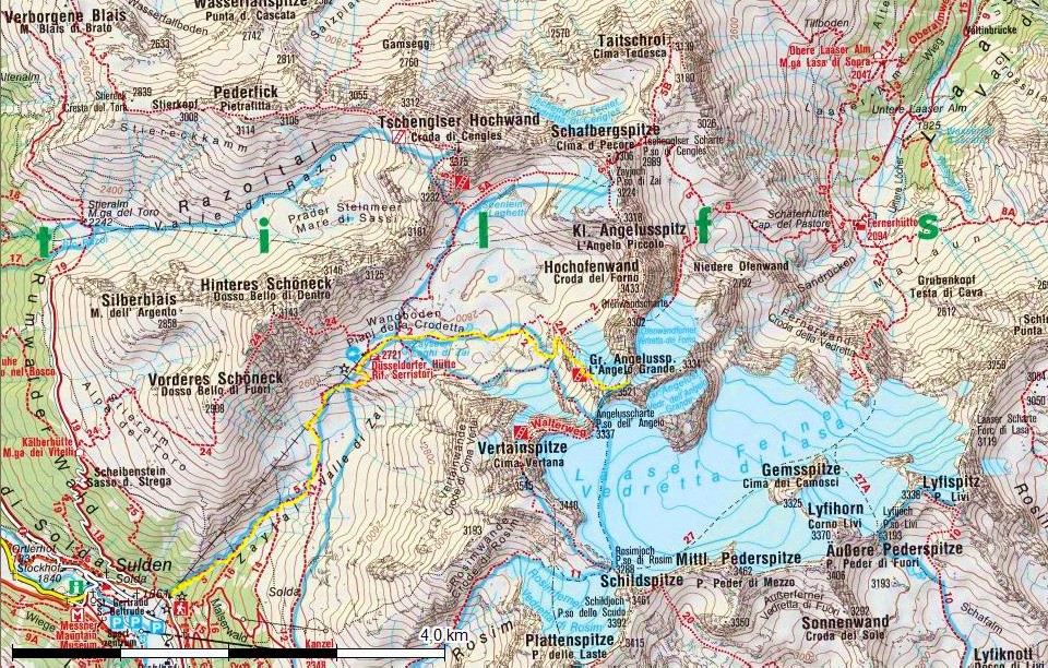 Zo Suldenu na chatu 880 metrov (2hod.), odtiaľ na vrchol ešte 797 metrov (2,5hod.)