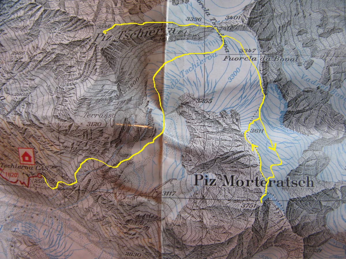 Tschiervahutte (2584m), rovnako ako aj nižšie položený Roseghaus (2000m) môžu však byť východiskom na výstupy na množstvo ďalších kopcov: Piz Roseg, Piz Scersen, Piz Caputschin... Najlepšie dostupný však asi bude už spomínaný Piz Tschierva. Nástup na túru je priamo nad rovnomennou chatou v smere výstupu na Biancograt. Cez skalnú stienku sa dostaneme pomocou reťazí a železných stupienkov. Po pár serpentínach sa chodník rozdeľuje: doprava na Berninu a ďalej smerom hore na Tschiervu a Morteratsch.