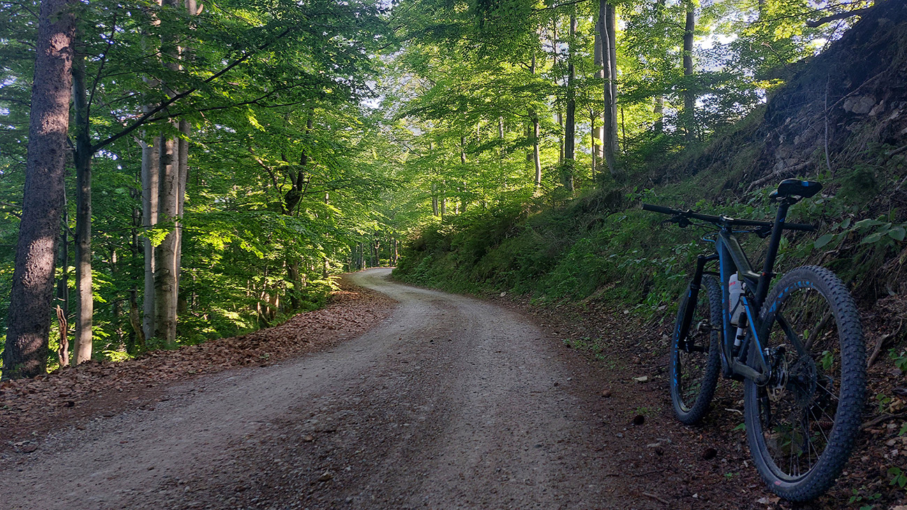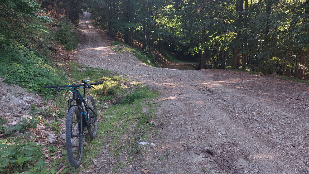Výjazd na bajku „na Maguru“ je z tých troch najkratší a asi aj najpríjemnejší – podľa Stravy 11,5 km a 730 výškových, ale najmä príjemné škvrčanie relatívne rovnej šotoliny pod kolesami po celý čas. Cesta väčšinou suchá, aj nedlho po daždi, to sa skôr prášiť bude (ako na jednej fotke výborne vidno). Takmer celý čas vedie v príjemnom tieni, aj keď cez početné rúbaniská sú tu otvory na juh, do kotliny. Sklon ľudský, len „cieľová rovinka“ nad sedlom Príslop je na niekoľkých miestach strmšia a aj v kombinácii s väčšími kameňmi pod kolesami môže slabšieho technika trochu vyškoliť. No a posledné metre na terasu pred chatou sú najstrmšie a najhrboľatejšie z celej trasy, ale tam sa vždy veľa ľudí prizerá, tam sa už jednoducho treba hecnúť a nedať sa zahanbiť :-)
