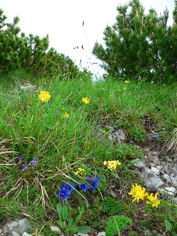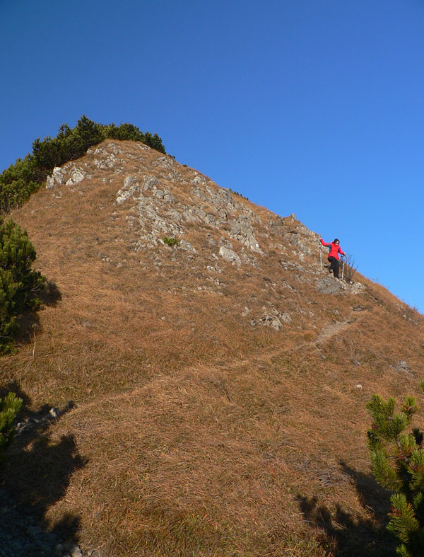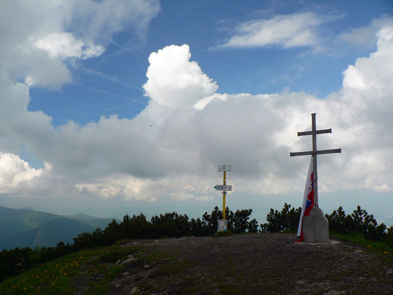 Slabšie povahy myknú doprava do traverzu Suchého, alebo doľava, do sedla Vráta (žlté značky). Lebo červená sa štverá hore tak, že aj ruky treba zapájať. Takú polhodinku - potom prichádza odmena na vrcholovej plošinke s trojvrším, dvojkrížom a jednozástavou. Výhľady exkluzívne, 360-stupňové, najlepšie pózuje Malý Kriváň na východe.