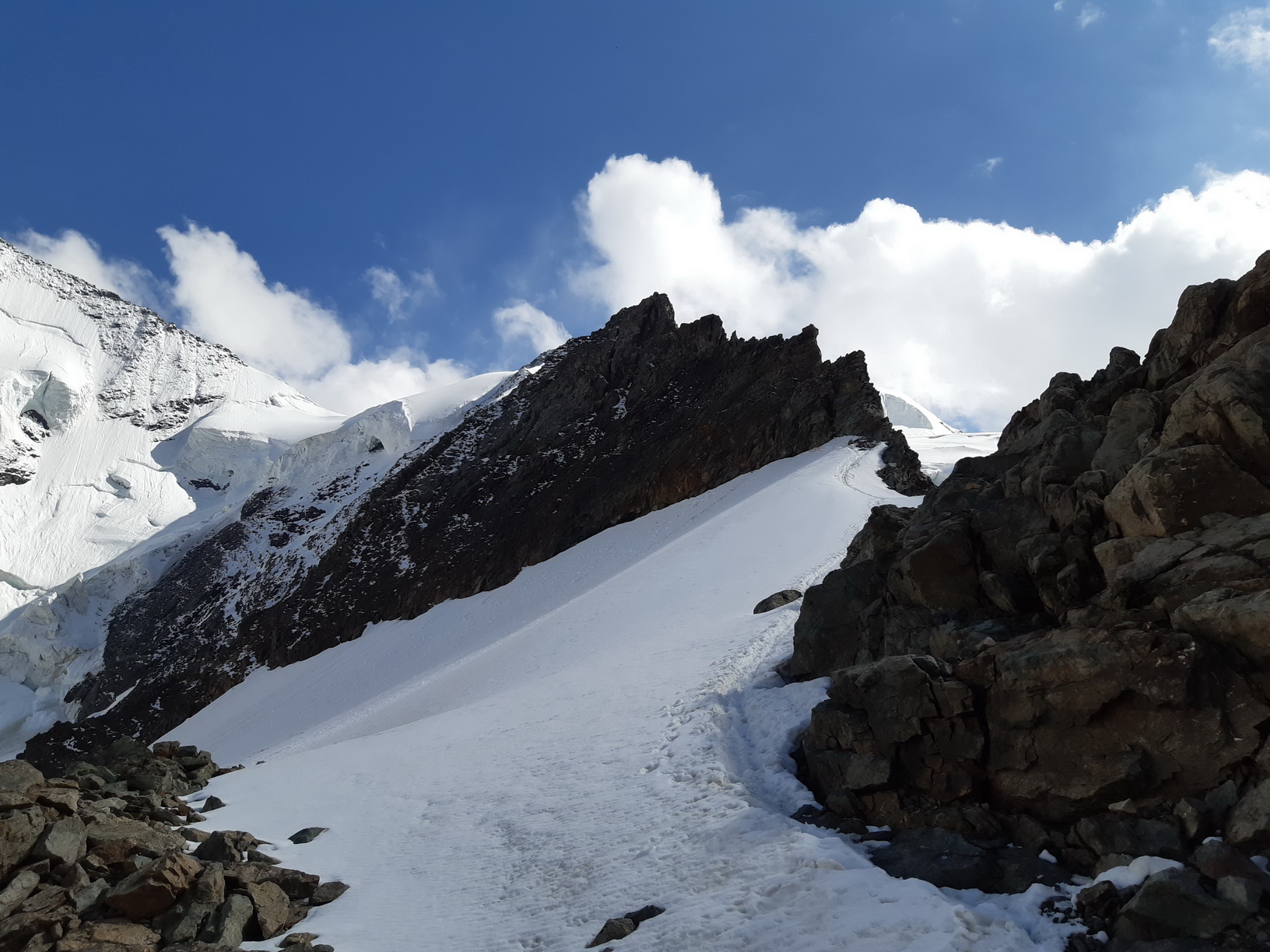 Prečo je tento skalný hrebeň taký dôležitý? Odpoveď je jednoduchá: lebo ľadovec... Áno ľadovec všade naokolo je prakticky nepriechodný a tak všetky cesty do oblasti najvyšších vrcholov z tohto smeru vedú práve tade, pomerne ľahkým 2+ a dobre odisteným skalným hrebeňom.
