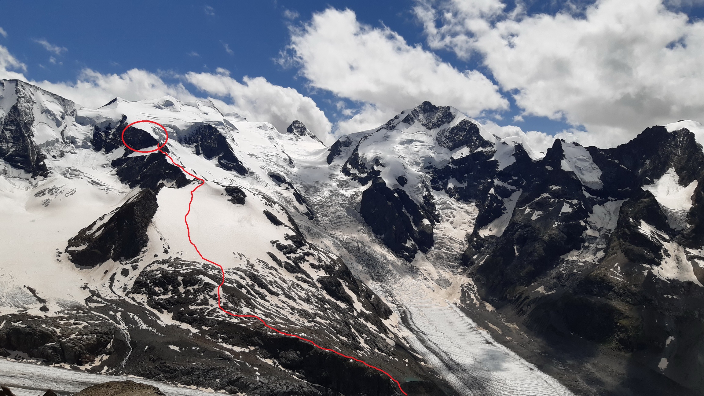 Samotný prieskum sa mi nedávno konečne podaril. Naľahko som vybehol z doliny Morteratsch kde som nechal zamknutý bajk. Počasie a podmienky mi dovolili prísť až ku hrebeňu a celý ho preliezť hore i dole. Nemal som so sebou žiadnu výstroj a tak som k nemu pristúpil s rešpektom a opatrnosťou. Pri postupe hore som si dobre obzeral kľúčové miesta a jedno som si aj hneď pár metrov zliezol aby som získal potrebnú istotu.