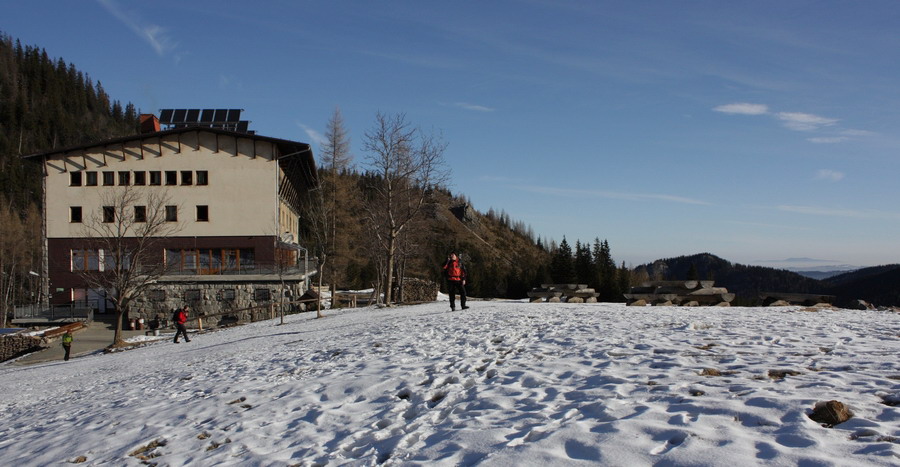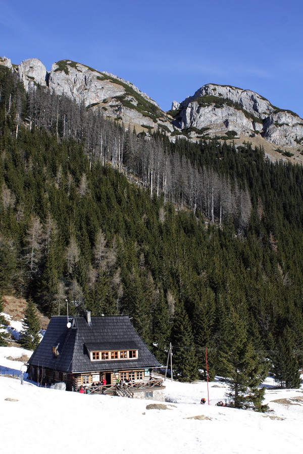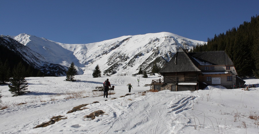 V zime však návštevnosť nie je až taká masová, tak sme sa rozhodli to využiť. Auto odparkúvame na záchytnom parkovisku v Zakopanom, časť Kuźnice. Cestovný ruch tu funguje na plné obrátky a tak do pár sekúnd je pri nás nastrčená dlaň a pýta parkovné. A keby sme prihodili ešte zopár štrngáčov, môžme sa odviesť na koči ťahanom silne zapáchajúcim kopytníkom až ku stanici lanovky. Vzhľadom na to, že lanovka je od parkoviska vzdialená sotva kilometer, tento exkluzívny zážitok dokážeme oželieť V okolí lanovky sa to ešte hemží ľuďmi, na značke a zratrakovanej stope je účastníkov pomenej. Svieži vzduch nás nabáda do tempa a tak asi po pol hodine prichádzame na poľanu Kalatowky. V hoteli testujeme funkčnosť WC a baštíme raňajky. Odtiaľto sa nám naskytujú prvé pohľady na slnkom zaliaty Kasprov vrch. Po pár povinných fotkách šlapeme ďalej lesom. Tu sa turistická značka hojne prekrýva s bežkárskou traťou, ktorá je miestami provokačne vyšmýkaná na ľad. Najbližšou zastávkou je chata na Kondratowej poľane. Štýlová chalúpka si sedí učupená v doline ako riť na šerbli, obklopená zo všetkých strán horami. O jej popularite svedčí aj kopa všadeprítomných turistov.