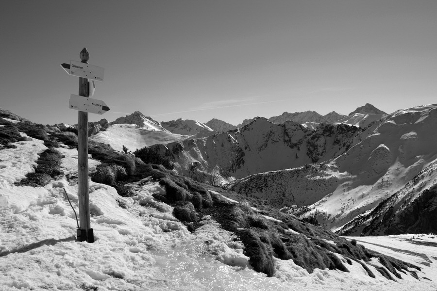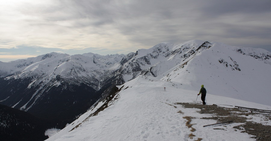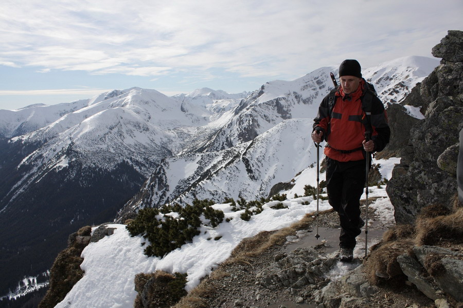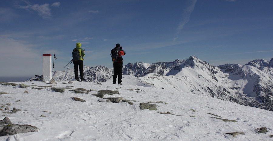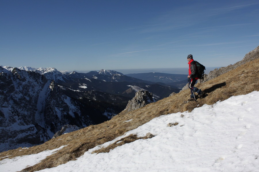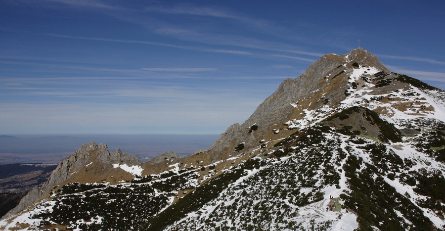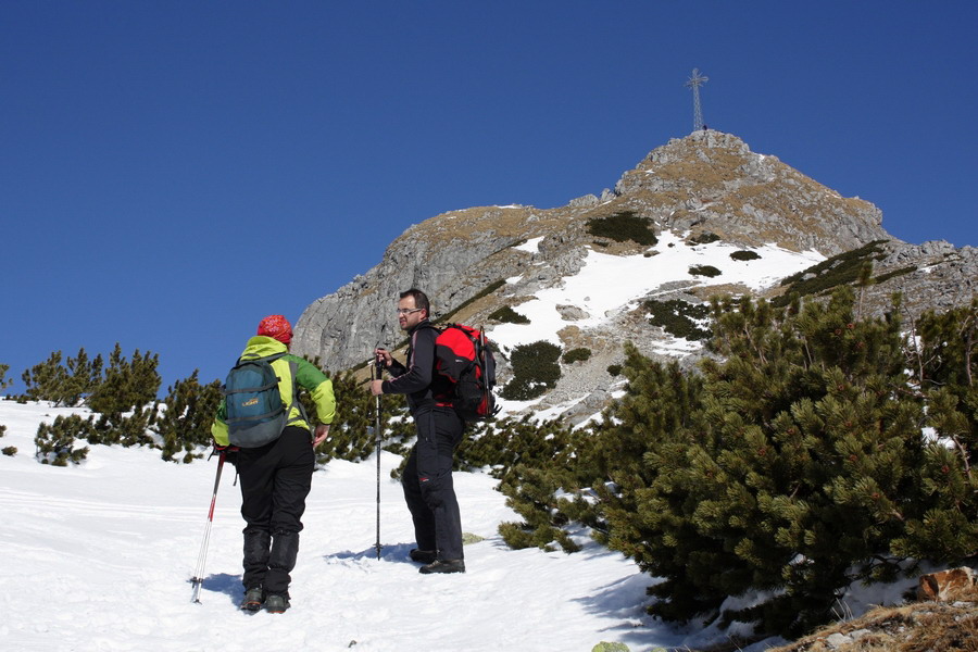 Nás blízkosť a krása hôr láka ísť ďalej Ešte chvíľu si vychutnávame oddychový terén v doline, no na jej konci treba aj čosi vypotiť. Do Kondráckeho sedla vedie síce krátky ale o to intenzívnejší výšlap. Po pravici sa nám stále ukazuje Giewont. Zdá sa nám až podozrivo blízko. V sedle nás víta mrazivý vietor, ale aj nekonečné výhľady. S každým výškovým metrom objavujeme čosi nové. Tesne pod vrcholom Giewontu sú v skalách naťahané reťaze. Máme šťastie, že snehu je málo a môžeme ich pri výstupe po primrznutom teréne využiť. Vrchol nás víta úplne opustený. V takýto luxus sme ani nedúfali. Kruhový výhľad nám otvára ústa a vyťahuje foťáky z batohov. Od Babej hory, cez Rozsutce, Kriváň, Swinicu až po Belianske Tatry - príroda tu hrá na ľudí očarujúce divadlo! Máme pred sebou ešte hodný kus cesty a tak opúšťame tento vrchol a presúvame sa bližšie k rodnej domovine.