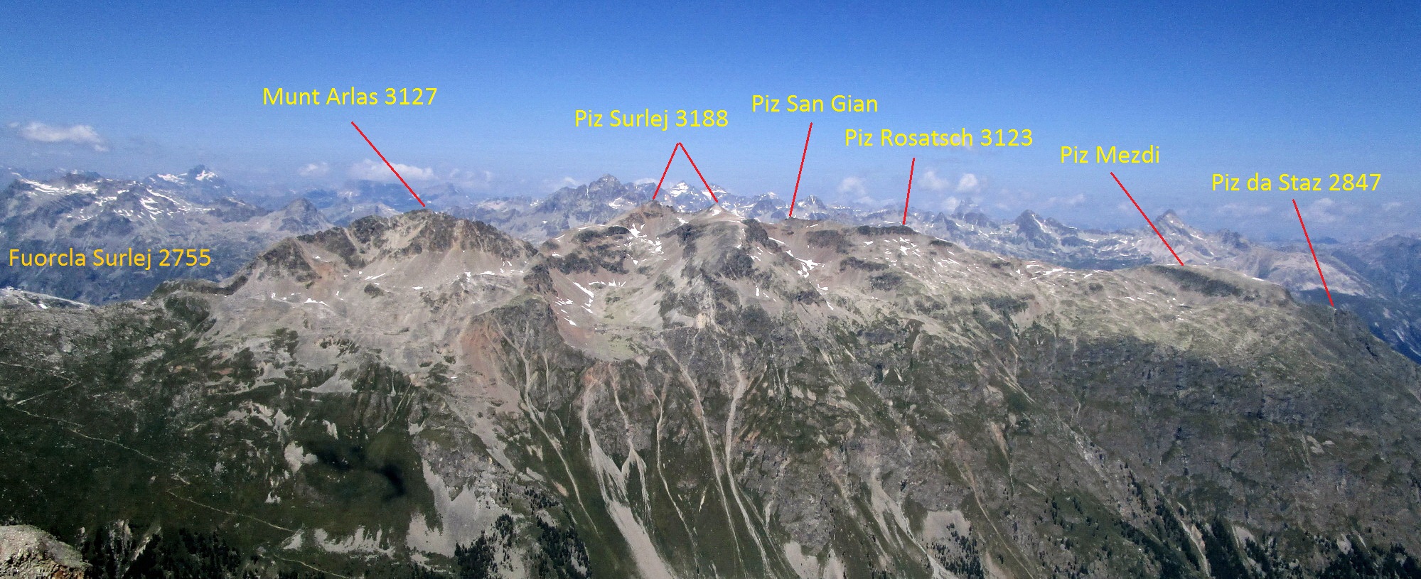Prechádzam cez Piz San Gian, oba vrcholy Surlej a blížim sa k vrcholu dnešného dňa: Munt Arlas. Kým predošlé vrcholy som poznal iba zo zimy, ten nasledujúci už som bol viackrát preskúmať aj v lete. Čaká ma náročný skalný hrebeň, exponované lezenie tak do trojky, množstvo voľných kameňov. Zostup poznám dobre, preto aj ostávam kľudný keď začnem liezť po stále viac a viac zvetranom hrebeni. Prichádzam k vežičke, ktorá dáva tušiť problémy už z diaľky.