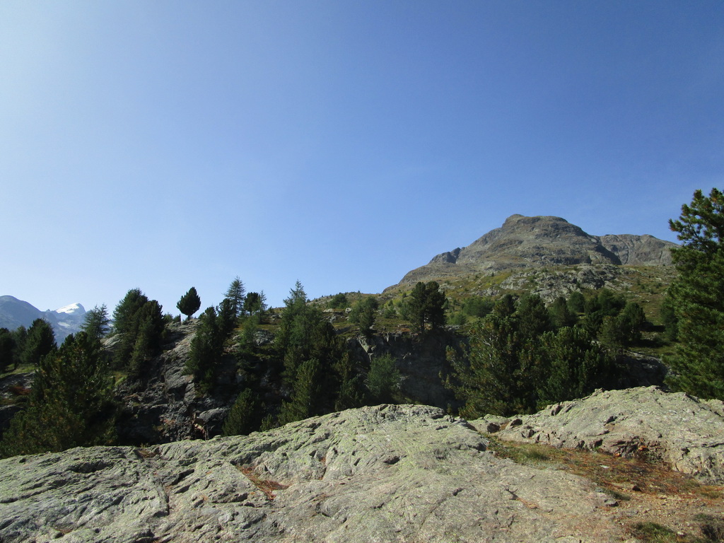 Pred Pontresinou som v prameni dočerpal tekutiny. Chystal sa teplý deň a bolo mi jasné, že na hrebeni kam sa chystám možnosť doplniť tekutiny nebude. Najprv ma čakal značkovaný chodníček serpentínami hore ku vyhliadke na hornej hranici lesa nad Pontresinou. Veľmi pekné miesto, ostatne asi ako všade naokolo...