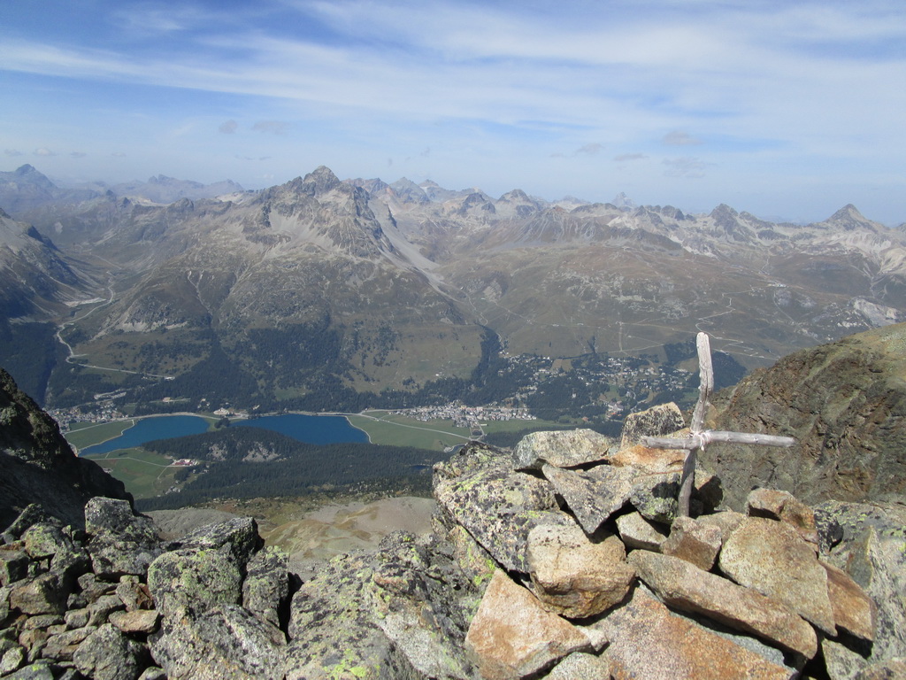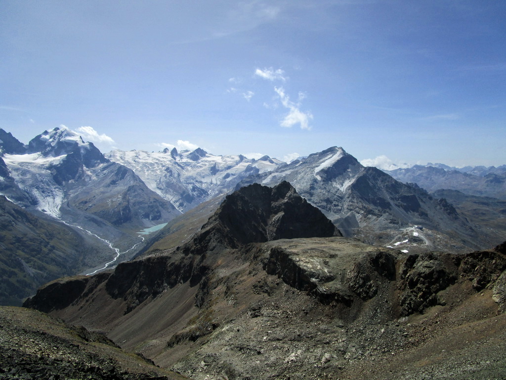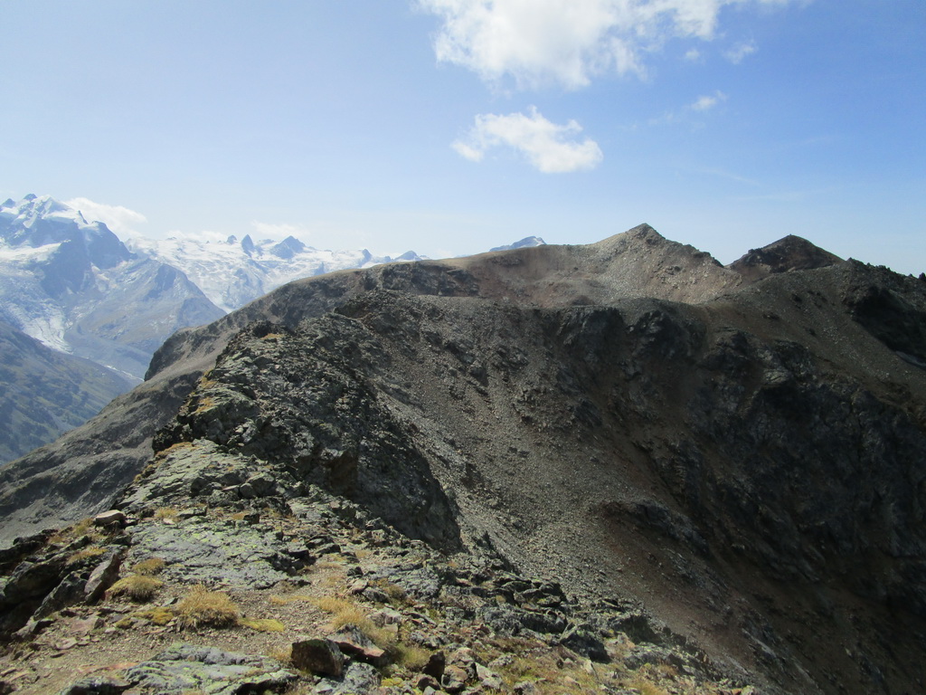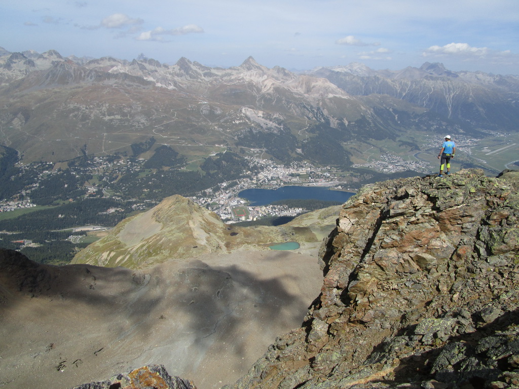 Na Piz Mezdi stretávam pár ľudí. Od Moritzu sem vedie značkovaný chodník. Sú to prví a zároveň poslední ľudia na hrebeni. Pokračujem cez Piz Rosatsch. Krásna expozícia ponúka výborné možnosti fotenia na samospúšť. Dnes to hojne využívam. Mojím cieľom nie je bežať a bojovať o každú minútu. Rýchle úseky presunu striedajú fotopasáže, kde pobehujem medzi statívom a pózovaním...
