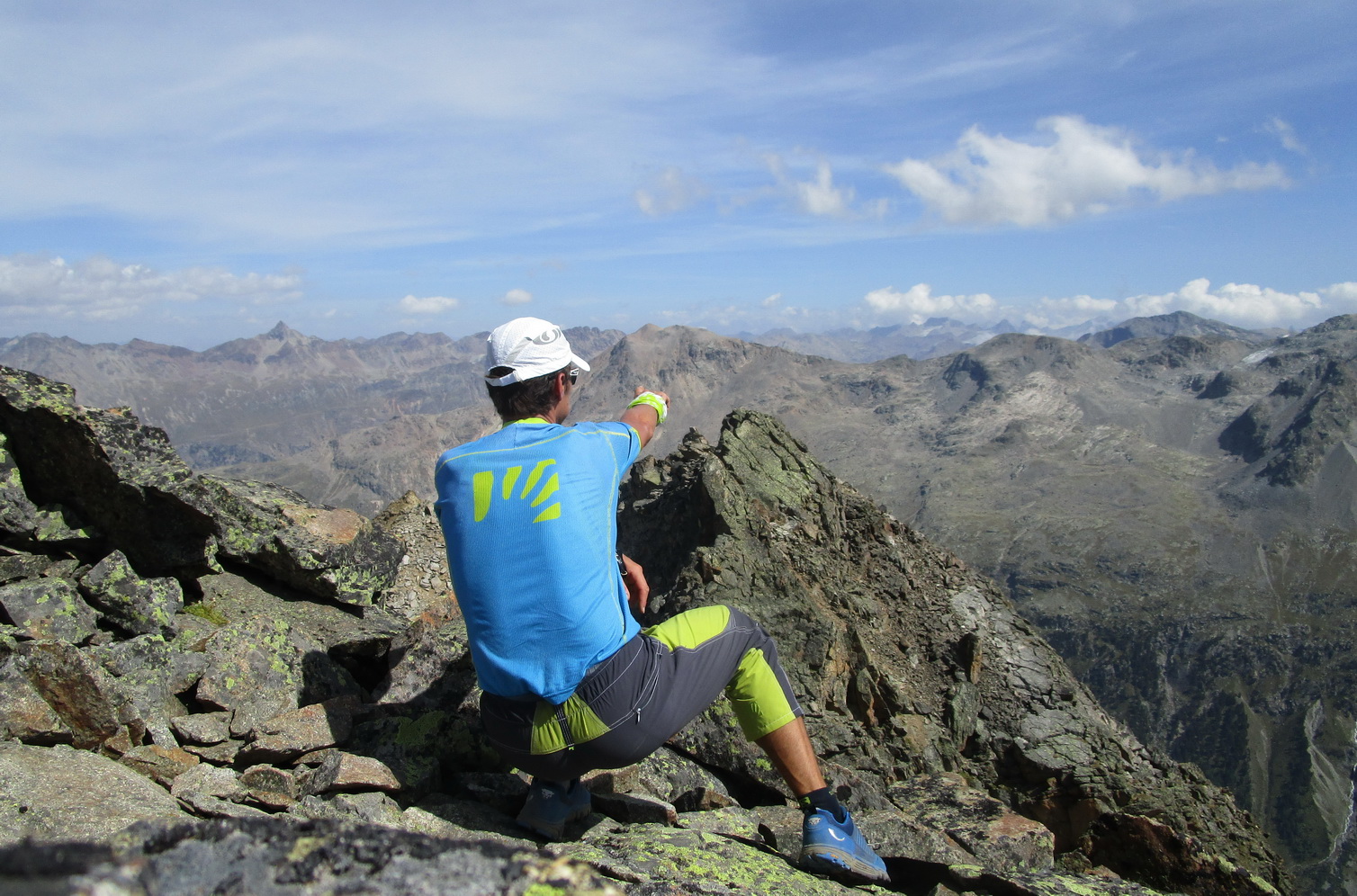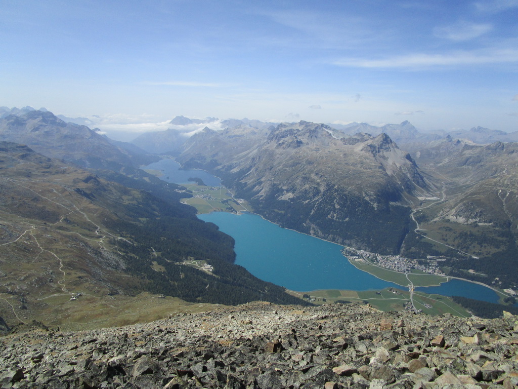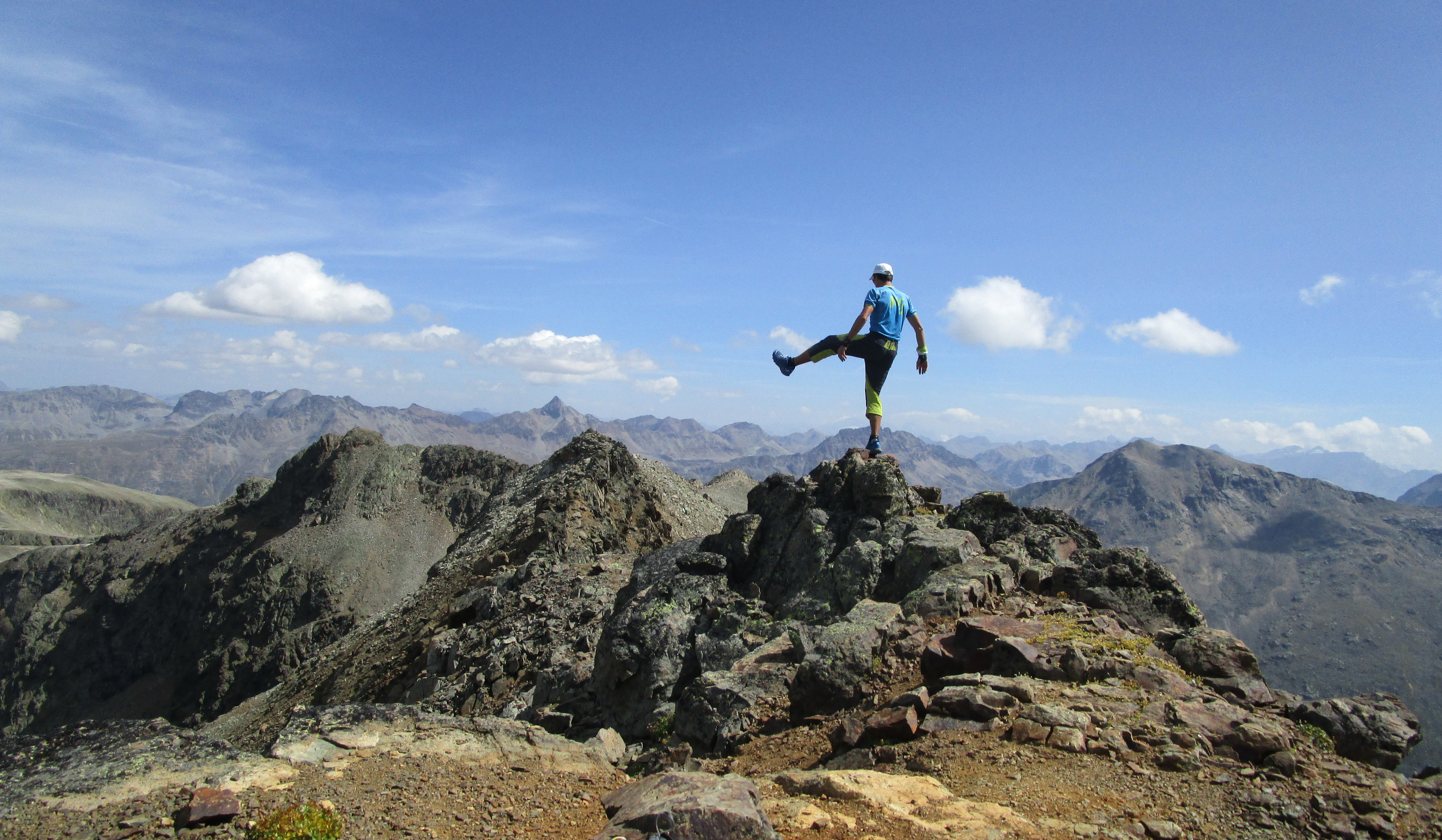 Na Piz Mezdi stretávam pár ľudí. Od Moritzu sem vedie značkovaný chodník. Sú to prví a zároveň poslední ľudia na hrebeni. Pokračujem cez Piz Rosatsch. Krásna expozícia ponúka výborné možnosti fotenia na samospúšť. Dnes to hojne využívam. Mojím cieľom nie je bežať a bojovať o každú minútu. Rýchle úseky presunu striedajú fotopasáže, kde pobehujem medzi statívom a pózovaním...