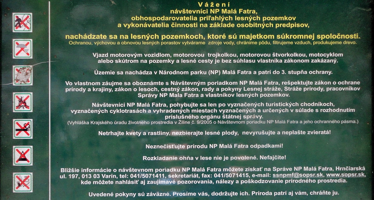 Ostatné roky je to ale akosi inak. Jazvy v lesoch pribúdajú a rastú, objavujú sa nové lesné „eurodiaľnice“ a pri nich tabule o rekonštrukciách protipožiarnych ciest a o rozvoji vidieka skrz skvalitnenie lesného hospodárstva. Na tých starých cestách ubúda tieň a pribúdajú rozryté úseky a „výhľady“. Len človek aby ani meter z oficiálneho chodníka neodskočil, lebo je v národnom parku. Dokonalá legislatívna schizofrénia, ktorá vyhovuje akurát špekulantom.