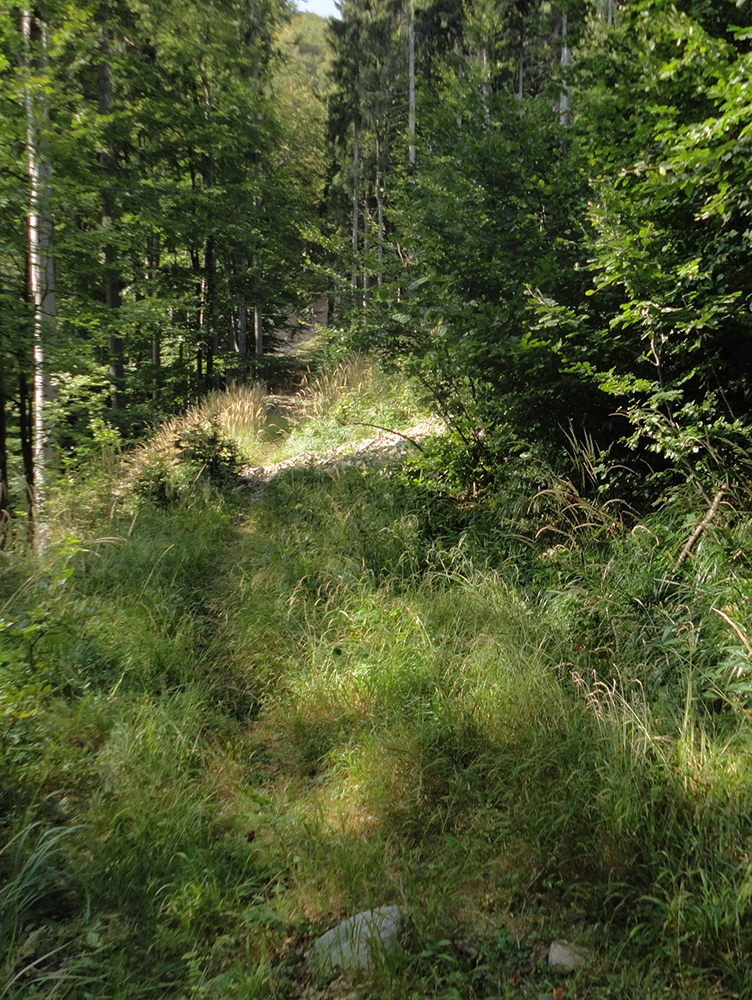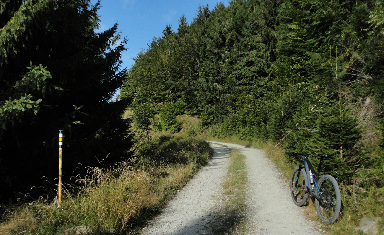 Ďalšia úloha je trafiť na rázcestie Drgová a tam preťať modrú značku (zo Sučian na Malý Kriváň). Najskôr jemne líznem podhorské lúky nad Trusalovou, stúpam zase po asfaltke. Pred jej koncom výrazná odbočka doľava do lesa. Spočiatku je lesná cesta široká, ale staršia, takže pekná, potom pribudnú rúbaniská. Ale aj výhľady dole do podhoria, napríklad na vojenskú strelnicu nad Sučanmi. Asi dve tretiny výšľap a posledná zjazd. Len pred koncom výšľapu sa treba poriadnejšie priprieť (strmo je tam a rozbito) - asi pol kilometra, ale jazditeľné všetko.