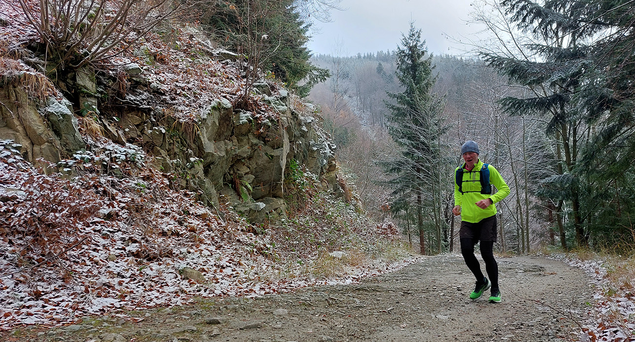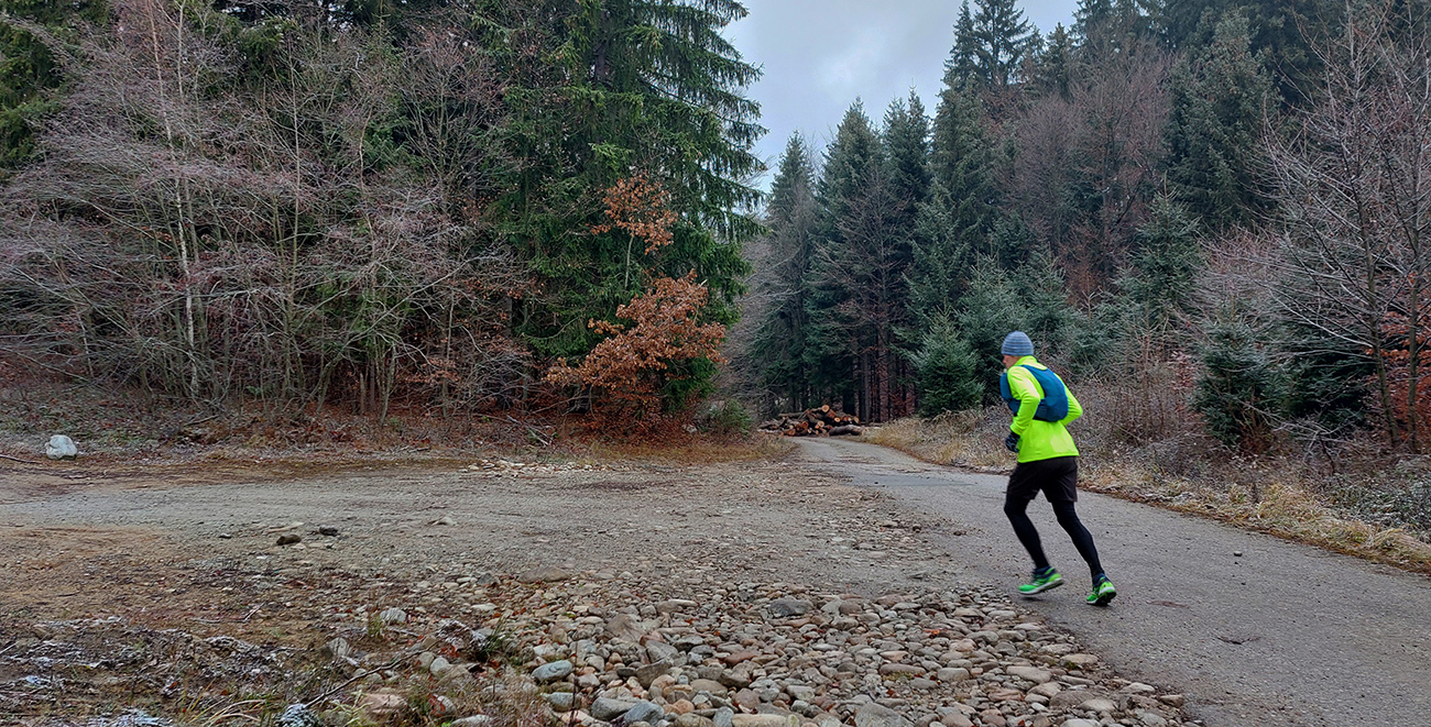 Hneď na úvod tie krásne, nové eurofondové serpentíny – do kopca po asfalte, z kopca do doliny Studenec vymakaná šotolina – takže netreba sa pozerať pod nohy, je tu priestor na obdivovanie prírodných krás (odhodené pneumatiky, dopravné značky, odparkované traktory...). Proste národný park ako má byť! Zo Šútova hore je to asi najdlhšie stúpanie na trase (6 km), ale až na ten strmší úvod nad dedinou sú sklony príjemné, veď zvážnicové, vyklusávacie, vykecávacie. A objavujú sa prvé náznaky prvého snehu.