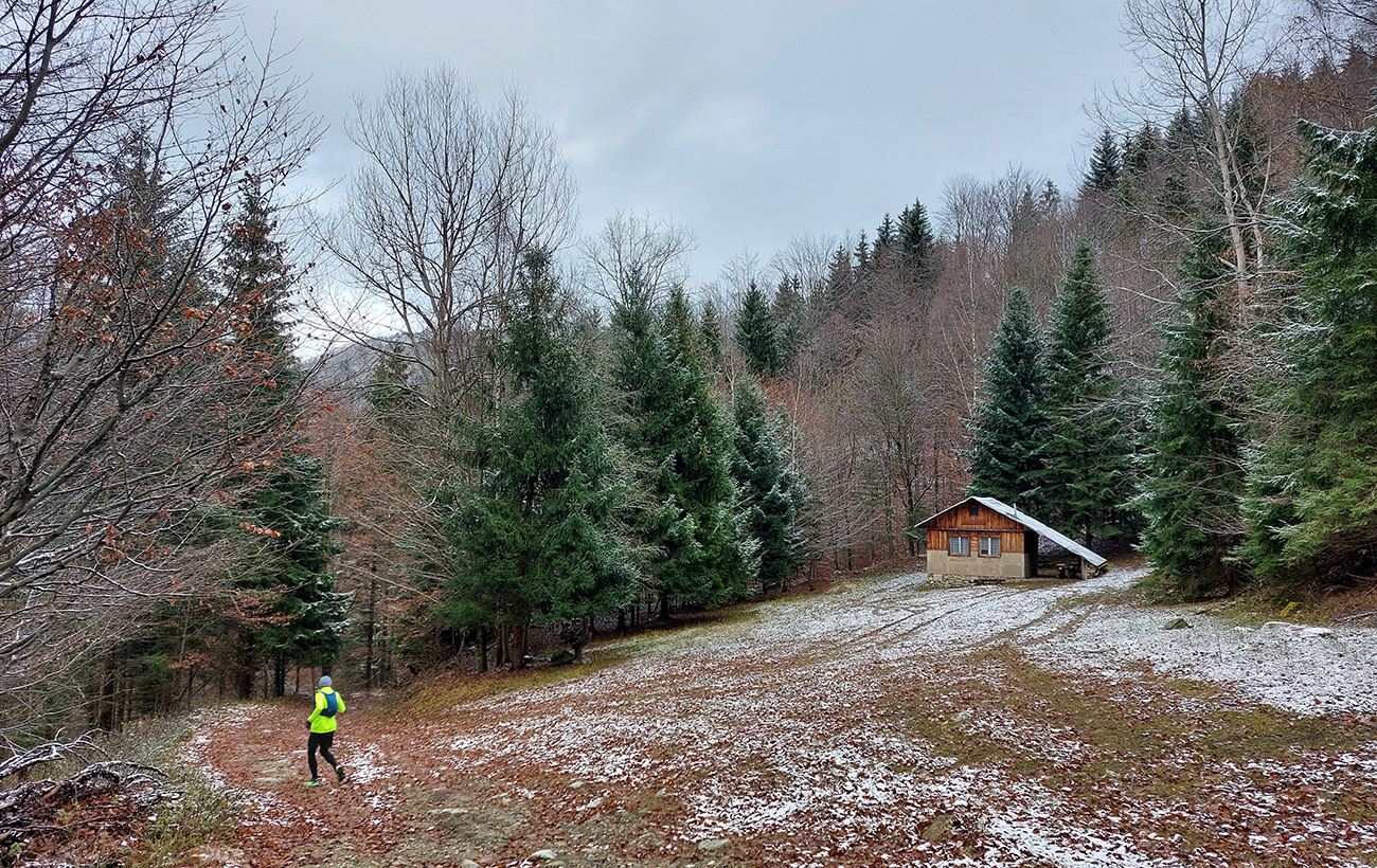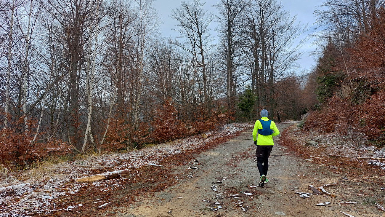 Toto stúpanie nie je dlhé ani prudké, striedajú ho aj klesavé úseky, pod nohami je príjemne – bielo a mäkko, napriek tomu mi to celé prestáva chutiť. Teda hlave to chutí stále, no telo z nepochopiteľných dôvodov stále viac štrajkuje. Nohy začínajú seriózne bolieť, ale čo je horšie, cítim, ako zo mňa odchádza všetka energia. Ale veď baterky dobíjam pravidelne a osvedčeným spôsobom! A natrénované mám túto jeseň toľko, že takýto výlet musí byť pre mňa lahôdka. Nerozumiem, ale kašľať na to - kríza príde a odíde. Akurát, že začínam zdržovať – najhoršie sa mi ide z kopca. Vatové nohy nedokážu vyrovnávať nerovnosti, došľapy začínajú bolieť tiež, periférne videnie sa zužuje... Hrôza toto! Ale aspoň oblaky sa trhajú, sem – tam slnko preblikne a cez „potrhané“ lesy sa otvárajú výhľady do Turca.