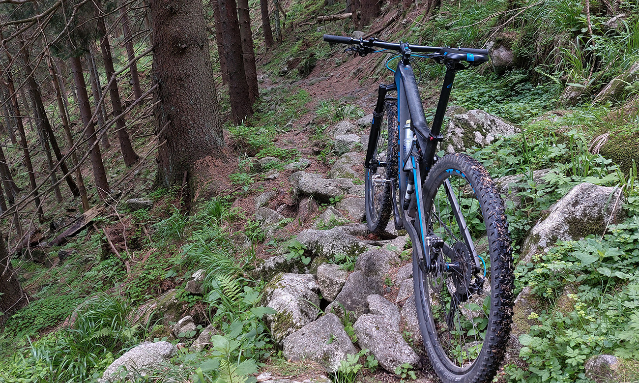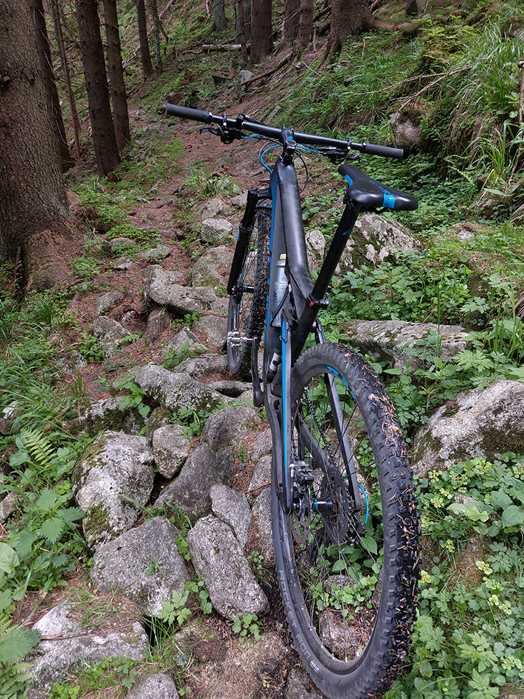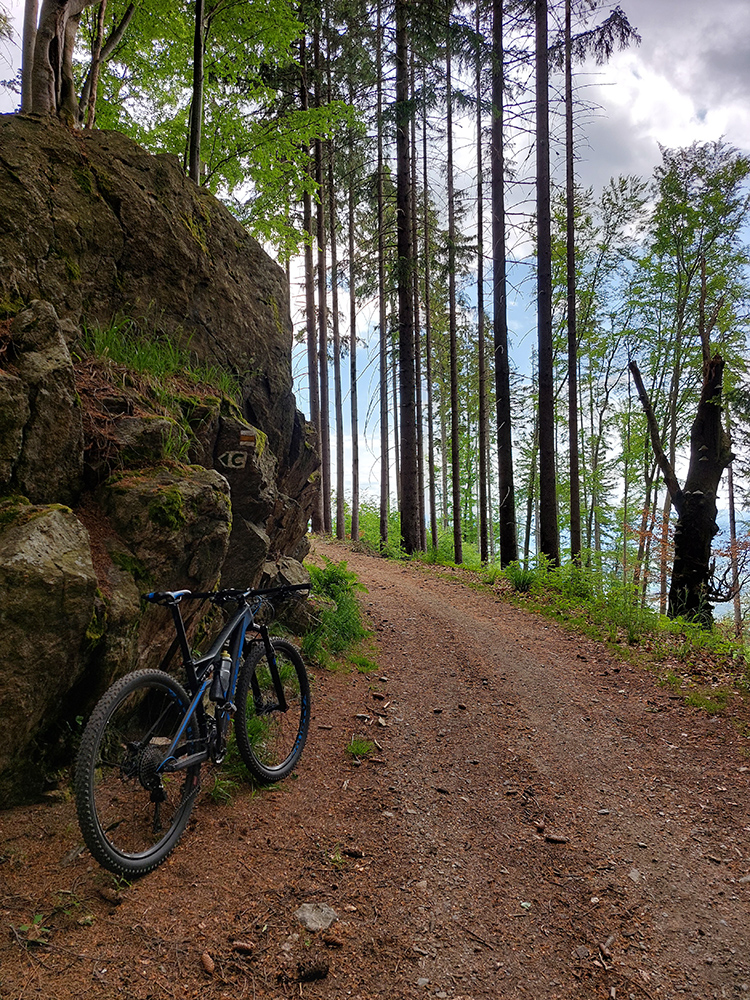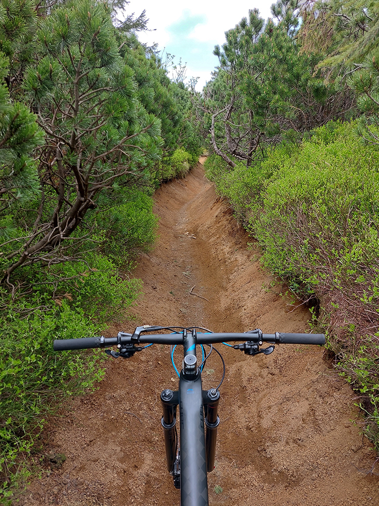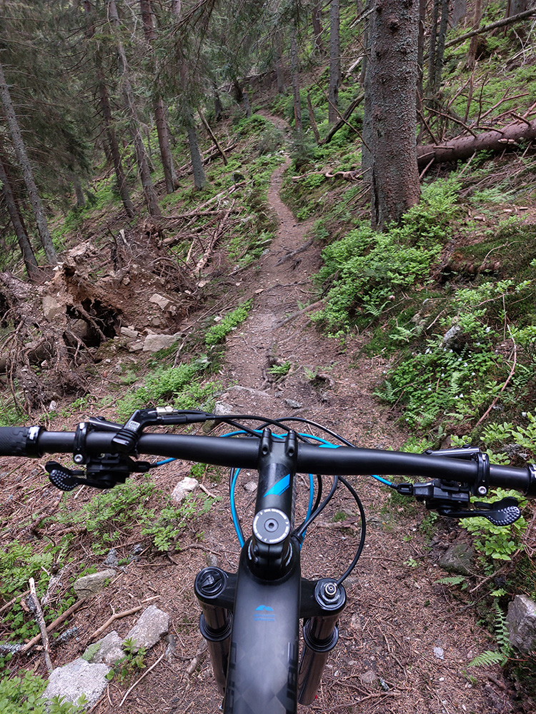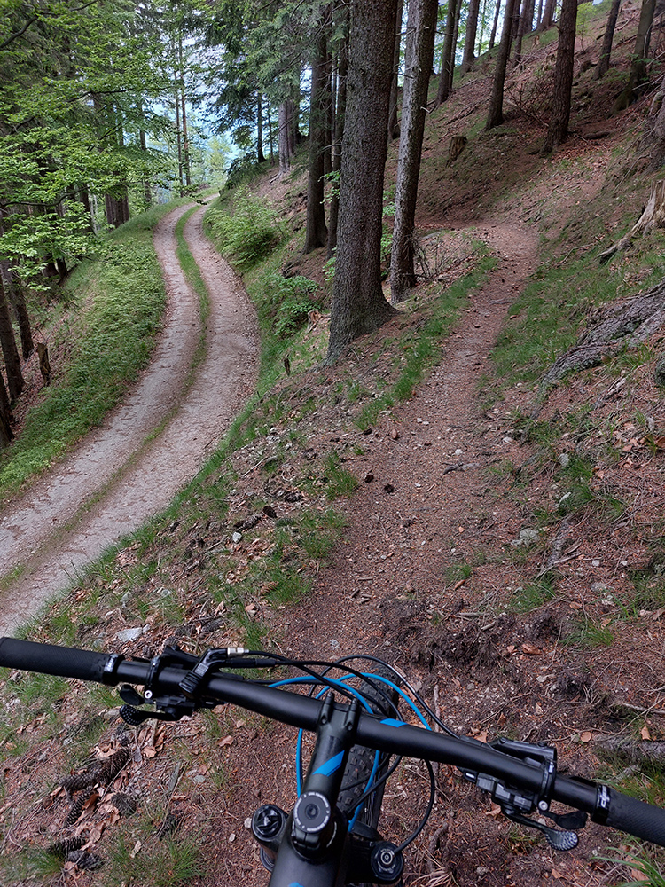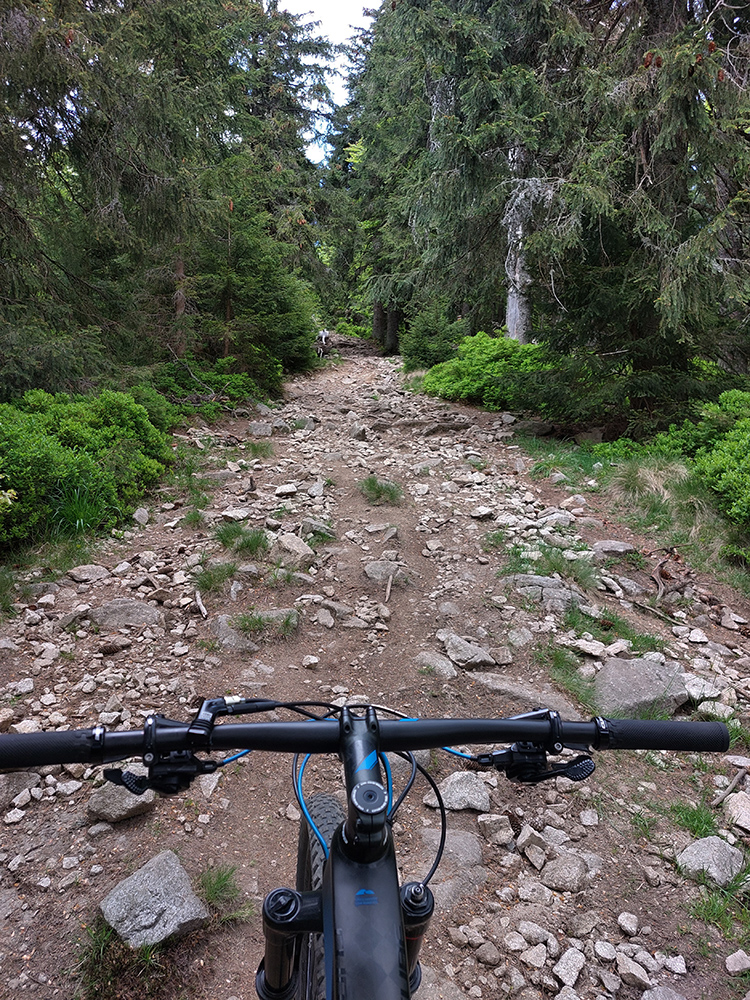 S vjazdom do stojaceho lesa sa to ale preklopí a singlík jemne klesá až na svoj severný koniec, dobré štyri kilometre, prevažne pekným, pestrým lesom. Hladkých úsekov je tu ale veľmi málo, flow nech nik nečaká. Len v strede a ku koncu je povrch trochu jednoduchší. Inak aj zopár krátkych rockgardenov je tu, ale najmä plno koreňov a kameňov. XC zdvihy ani pevné sedlovky tu nie sú doma, ale opatrne to celkom ide. Len treba byť neustále presný v nájazdoch do medzierok, lebo chodník je aj úzky a často naklopený do svahu. Neustále sa vlní doprava – doľava, miestami sa aj nakrátko zdvihne. Pestrý je, len treba aspoň trochu vedieť jazdiť. Na konci krátkym zošupom vyúsťuje na zvážnicu, ktorá je už dlhšie pár metrov pod ním viditeľná.
