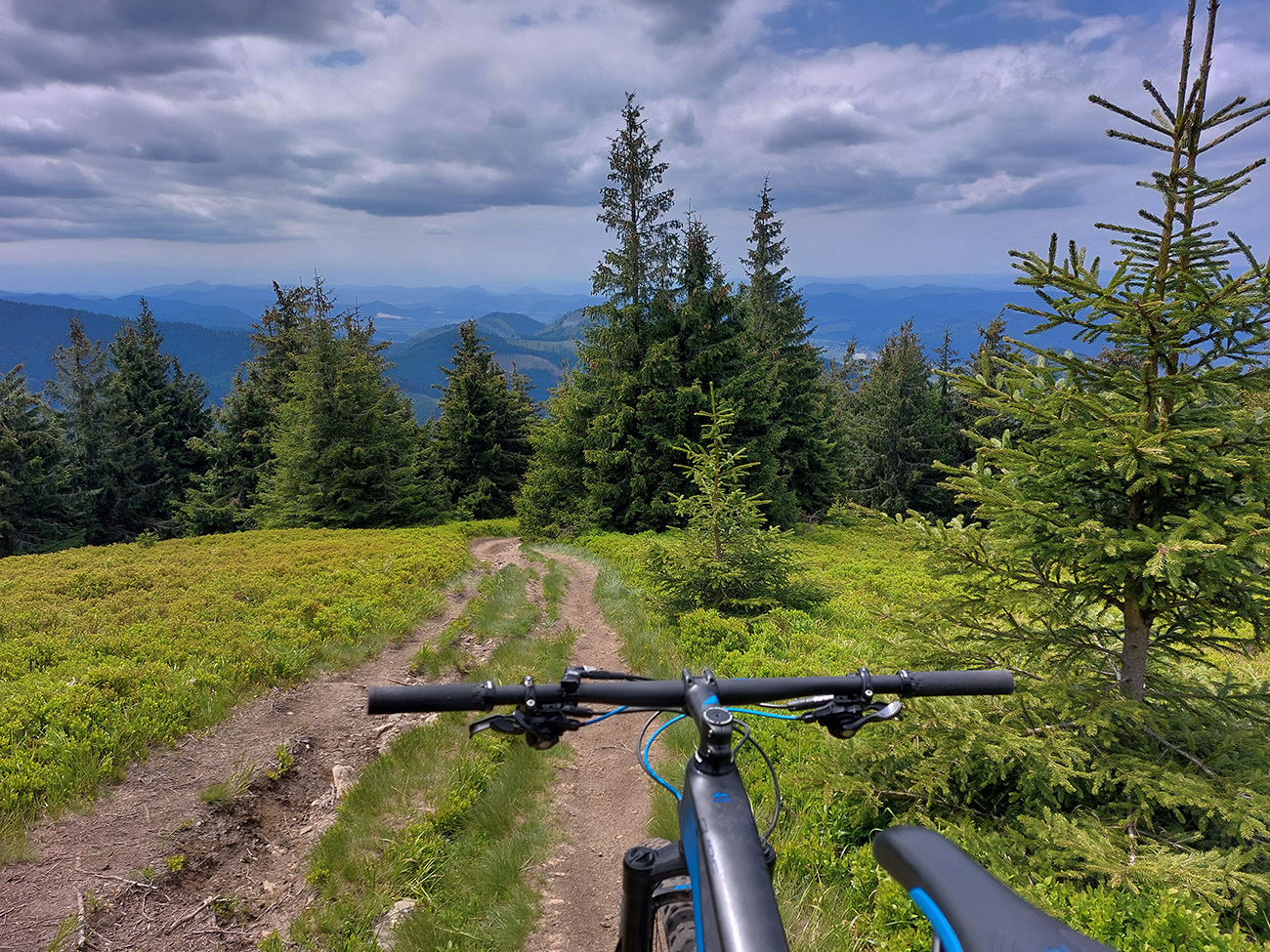 Takže na úvod technickej časti hrebeň medzi Krížavou a Minčolom. Obchvat vysielača úzky popri plote aj v tuneli z kosodreviny - tam prosím nasledovníkov ohľaduplne, pešiaci majú prednosť. Potom striedanie rovných úsekov po lúkach aj v lese, medzi nimi zo tri technickejšie zjazdíky po výmoľoch, koreňoch a voľných šutroch. Pekné, hravé jazdenie.