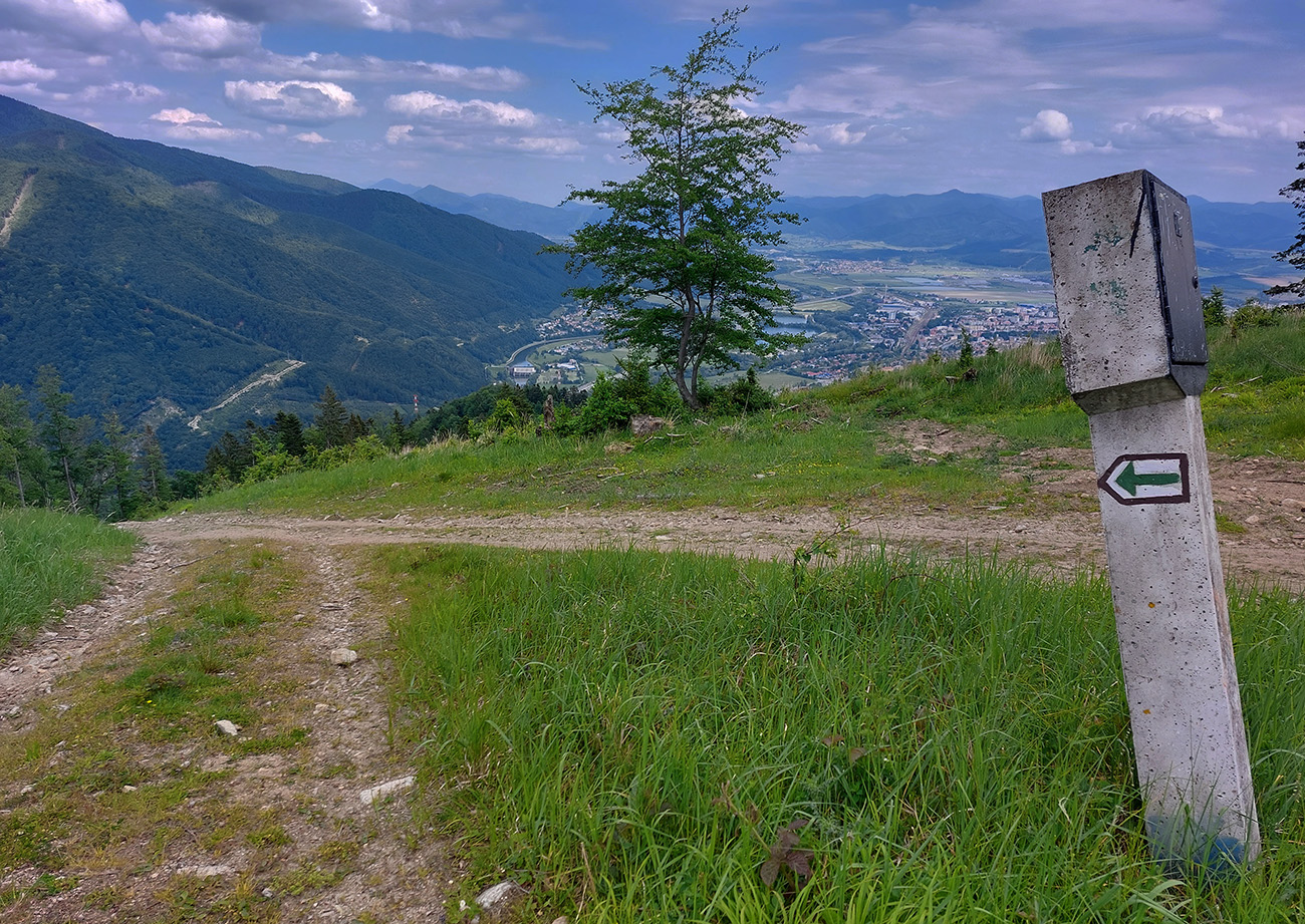 Podjazd Minčola priamo zo sedla Prašivé (zreteľný chodník doľava) som odignoroval, smerujúc o kúsok vyššie. Ale som rýchlo zistil, že ten na mape vyššie nakreslený chodník je nepoužiteľný, lebo zarastený. Tak som sa už nevracal a tých pár strmých minút ku dvojkrížu som vytlačil. V dave som si počkal na svoj fototermín a už som sa drncal dole, po modrej smerom na západ, v ústrety panoráme Rajeckej doliny.