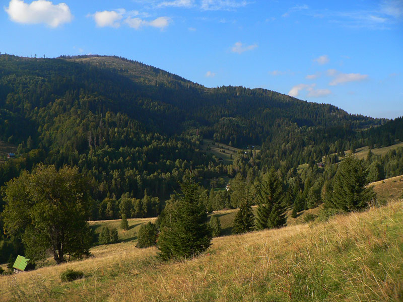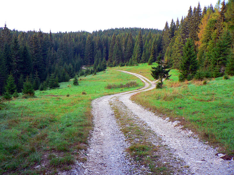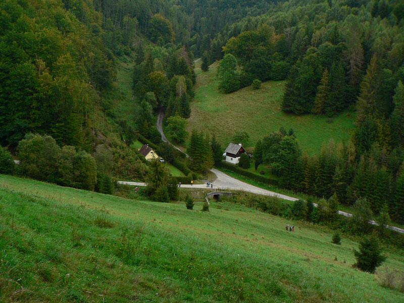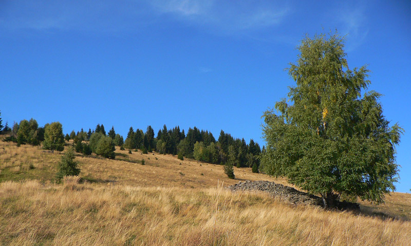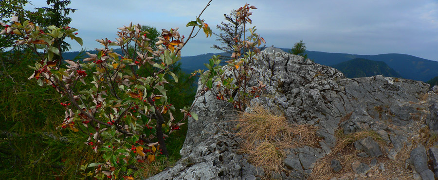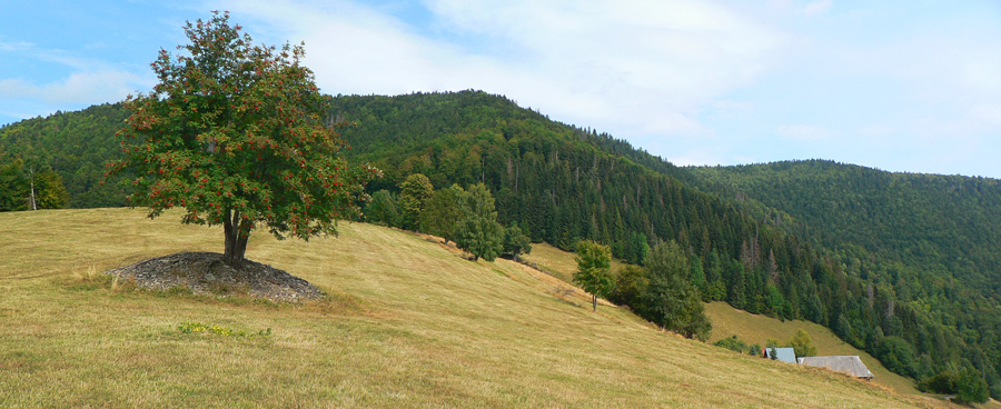 Nestalo sa a tak konfrontujem na vyhliadke realitu s mapou a chlieb s konzervou. Chcem sa spustiť medzi lazy a z jednej doliny prejsť cez kopec do druhej. Viem aké staré mapové podklady používa VKÚ a ako sa lazy zmenili za posledných 60 rokov. Ale pôjdem po lúkach, to trafím aj po hmate :-) Do doliny v pohode, krásne pasienky, ovečky pobehujú, jarabina na hŕbe skál pózuje, zdravím chalupárov a koštujem jabĺčka v starom sade. Dolu na križovatke by som mal trafiť cestu na Petovcovo, popri potoku. Ale kde už je tá – dávno zarastená, a dokonca za plotom. Veď domáci poradia. Poradili ochotne a už sa aj štverám hore pasienkami, strmo ako po streche. Keď ovce tade chodia, aj ja môžem. Na kopci salaš, oštekali ma psiská riadne, chlapi nič – dojenie v plnom prúde, nieto času. Cesta vedie do lesa, musím dávať pozor, aby som nezašiel kam nechcem.