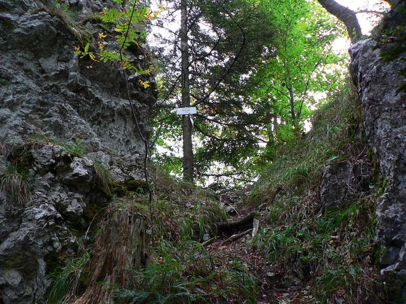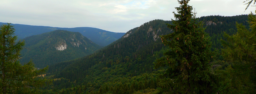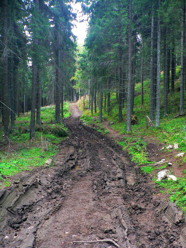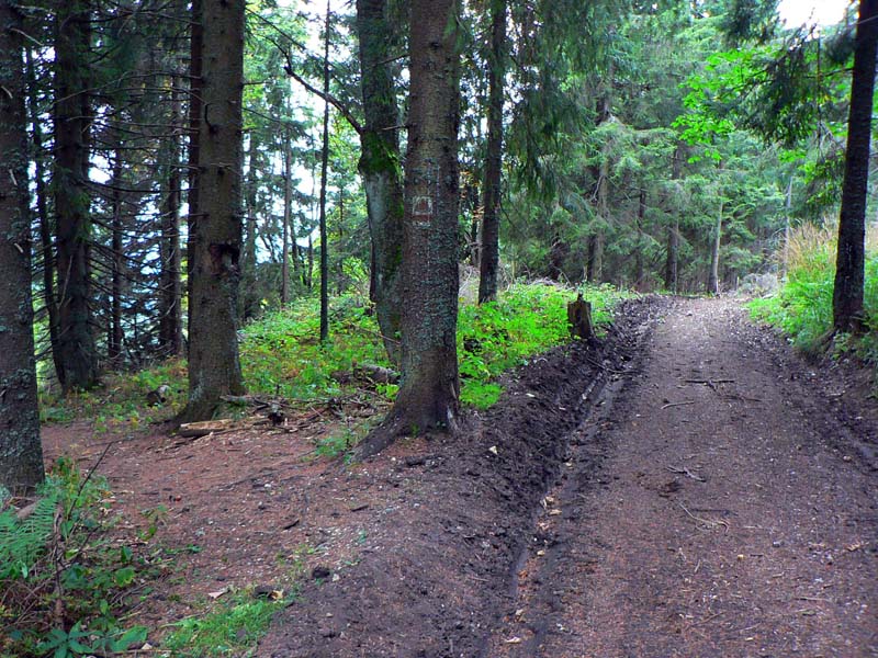 Ďalším cieľom je Skalná brána, osamelé bralo s vyhliadkou na Stožky a Fabovu hoľu. Výhľad pekný, ale zahmlený. Dúfam že nebude pršať, hore to akosi hustne. Znova prudký zostup, koľaje po traktoroch dosahujú rekordnú hĺbku! Uvažujem: keby išiel jeden oproti, budem riskovať pokutu za pohyb mimo značeného chodníka a uhnem, alebo sa nechám prejsť? :-)