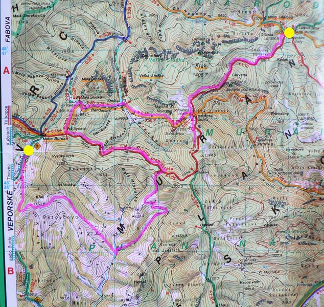 Pod Vysokým vrchom sa zas napájam na červenú Rudnú magistrálu. No, tu by ju mali premenovať na Traktorovú. Kúsok doprava je sedlo Burda, pod ním chcem dnes prespať. Ale ešte ani poludnie nie je a plán velí: doľava! Na východ, smerom k Sivákovej, pred ktorou je na mape nakreslená vyhliadka. Tam značkovanú trasu opustím. Ale najskôr zákruty tejto „Rudnej zvážnice“ popod hrebeň. Jedinou výhodou sú výhľady na obe Stožky cez rúbane, ktorých je tu viac ako normálneho lesa. Zrazu ma šípka vyháňa do svahu, kde ani chodník nevidieť. To čo, nejaká obchádzka? Ale nie, to sa len rudná zvážnica zmenila na rudné rúbanisko a ja vďačím slnku, že dnes už rosu vysušilo. V tejto divočine by som bol po pár metroch mokrý ako myš. Značky síce pekné, nové, ale v húštine kríkov a trávy vyše hlavy. Aby som medveďovi na labu neskočil...
