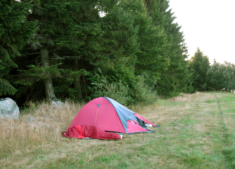 Vstávam dobre vyspatý – nechcelo sa mi tlačiť v stane, ktorý je len teoreticky trojmiestny. Veď dnes už končíme, nevadí trochu rosy na spacáku. A noc bola suchá, lúka mäkká, nebo jasné. Stopy od medvedích zubov alebo od pneumatík na tele nemám, tak je dobre. Zvyšné dva mäkkýše sa ešte prevaľujú v stane, tak sa obzerám po lese po nejakých hubách, ale je tu riadne sucho, nikde nič. Maťa včera vyhlásila, že dnes bude popri ceste huby zbierať – no, bude mať čo robiť.