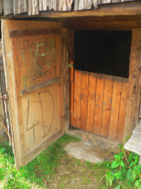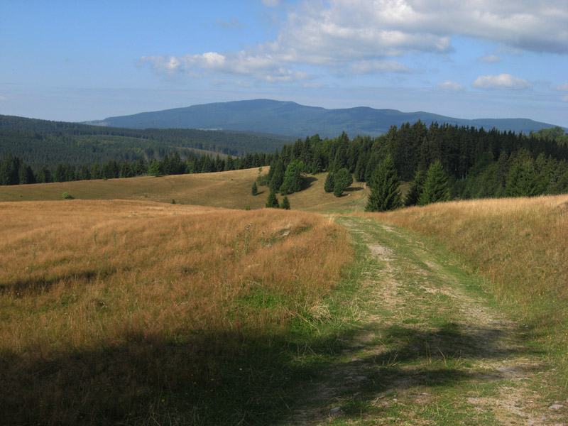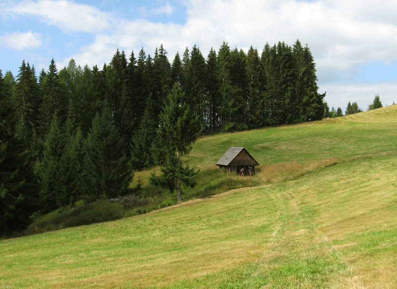 Prvý úsek pripomína skôr prechádzku po parku – sprava les, zľava lúky, skupinky stromov, sem tam dom, kráčame po spasenej a pokosenej tráve alebo po poľnej ceste. Len škoda že asi kilometer pred sedlom Tlstý javor vedie značka po asfaltke, aj keď teraz (v nedeľu ráno) premávka nie je takmer žiadna. Za sedlom sa po krátkom pochode lesom znovu dostávame na krásne lúky, už dohola vykosené. Po ich hornom okraji vedie popod les pohodlná „lúčna“ cesta – toto keby sme vedeli tri dni dozadu, nemuseli sme sa trmácať po asfalte hore Kamenistou dolinou. Dalo by sa tadiaľto aj za dažďa bez strachu o mokré nohy. Od smerovníka na Obrubovanci si trochu zachádzame odbočkou cez lúku – treba obzrieť a odfotiť aktuálny stav opusteného salaša. Výborné miesto na bivak! Pod drevenicou mätovo-žihľavová húština naznačuje prítomnosť vody a pramienok je dosť výdatný aj na skromné sprchovanie z fľaše.