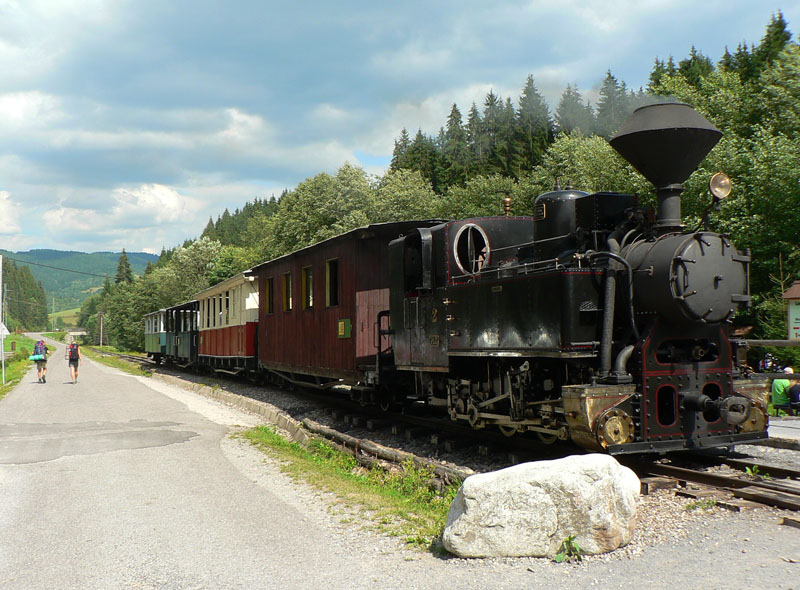 Vraciame sa ku smerovníku a po malom blúdení nachádzame cestu do doliny, ktorou vedie žltá značka. Prechádzame postupne popri niekoľkých lesníckych zruboch a senníkoch a asi po hodine príjemného, ale monotónneho pochodu v tieni lesa sa vynárame v ústí Obrubovanskej doliny pri parádnej horárni. To už šliapeme hodnú chvíľu po asfalte a k ďalšej horárni na hornom konci skanzenu to máme ešte skoro dva kilometre. Míňame jedno z bývalých nákladísk úzkokoľajky – dnes je tu stanový tábor pre deti a brigádnikov a koniec poslednej zachovanej vetvy železnice, ktorej sieť mala voľakedy až 132 kilometrov.