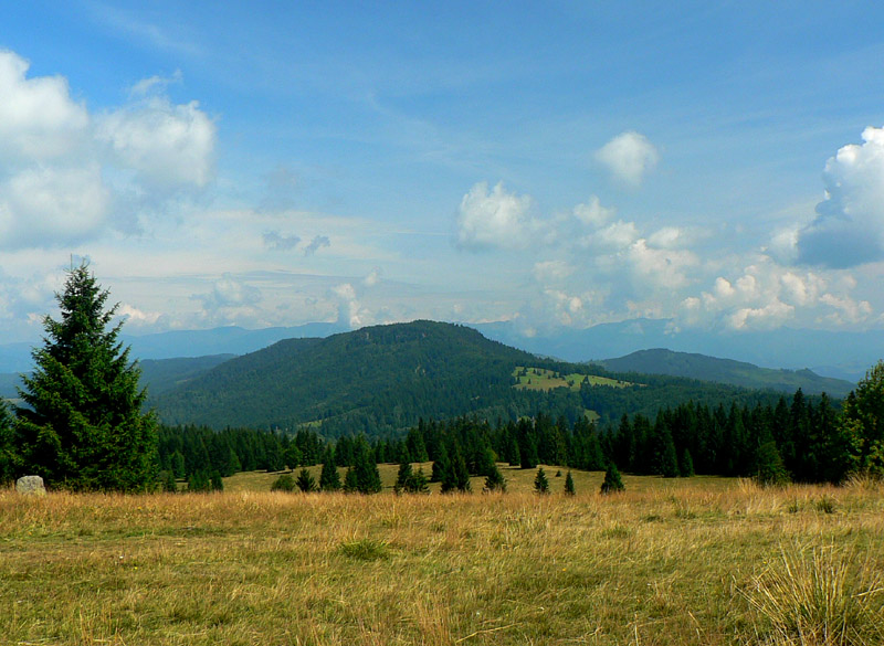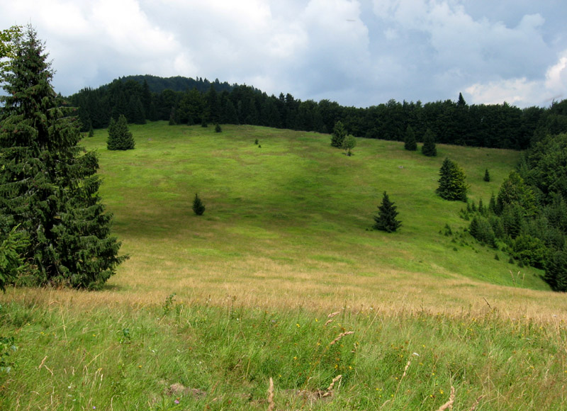 Trojčlenná expedícia vyráža ako vystrelená 12. augusta zo Šajby (pre cudzincov Strelníky, blízko Ľubietovej), plné batohy ešte netlačia. Cesta po zelenej na Ľubietovskú Bukovinu je riadne do kopca, striedavo po lúkach a zvážniciach. Zvuky motorových píl a kravských zvoncov sú všadeprítomné a čím sme bližšie k salašom na kopci, tým viac pribúda stôp po kravách na ceste aj mimo nej. Otvárajú sa prvé výhľady na Horehronie aj na Banskú Bystricu, škoda len že je vo vzduchu veľa pary. Na pasienkoch Bukoviny už pastieri bývajú v „moderných“ maringotkách, stará koliba slúži ako štýlová turistická útulňa. Len vody tu niet, nenašli sme v blízkom okolí žiadny prameň. Blízke napájadlá pre dobytok vyzerajú dosť zanedbané. Zato Maťa vylovila z trávy krásny dubák, nechávame ho na stole pred kolibou - hádam si ho pastieri spravia na večeru, keď pôjdu so stádom nazad z paše.