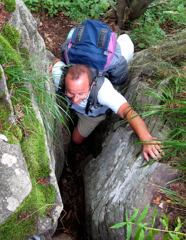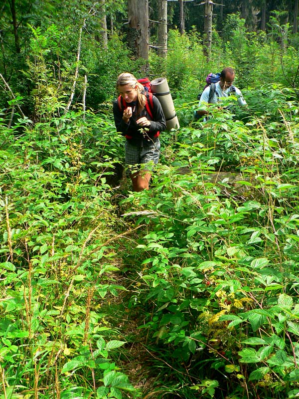 Záverečný krátky šplh po skalách je takou čerešničkou na torte, s napchatými batohmi to ale nie je veľká sranda. Na vrcholovej plošinke bordel neskutočný, dokonca aj ohnisko je tu – názov kopca asi priťahuje dvojnohé svine. Dávame obednú pauzu a zisťujeme, že sme od rána toho veľa neprešli – ale rozkaz znie nehnať sa, užívať si, improvizovať. Veď do tmy niekam dôjdeme. Presun na severný vrchol masívu - Hrb je ešte pomalší, tým malinám sa jednoducho nedá odolať! Ale zmedvedieva sa tu poriadne, porast je hustý a malín neúrekom. Hrb je považovaný za stred Slovenska, ponúka výhľady z dvoch plošiniek (na všetky sveta strany okrem juhu) a rovnaké smetisko ako Vepor. Okolo smerovníka je to tu viac vydupané, veď chata je len pol hodinku odtiaľto a dá sa tam aj autom dostať. Zostup k nej je s „plnou poľnou“ riadna zaberačka najmä v hornej časti pomedzi skaly.