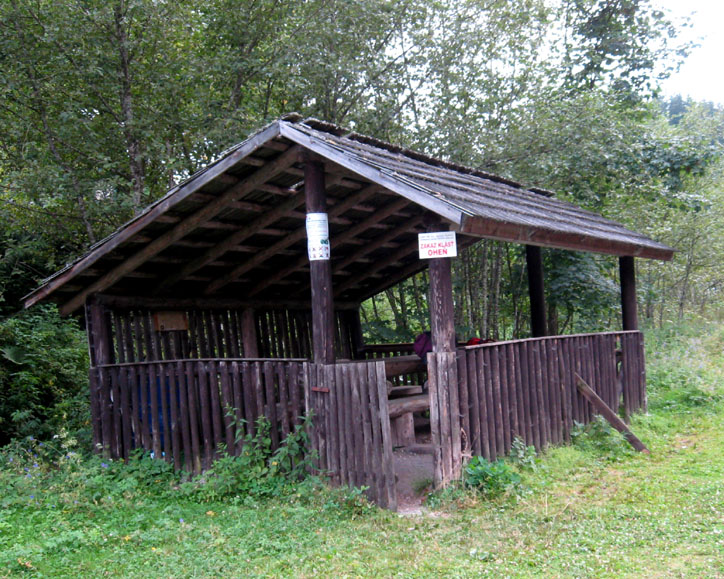 Šopu sme nakoniec našli, na povale drevárne je parádne čisto, len sa netreba veľmi vystierať, aby sme pavúkom neničili ich dielo. Aj rebrík je pod stenou položený, tak hádam ani medvede nepôjdu po našich zásobách. Výhodou „ubytovne“ je možnosť okúpať sa v potoku pod mostom, kam nie je z cesty vidieť, ale aj možnosť najesť sa v prístrešku pri vysokej peci. O tej sa niečo dozvedáme z parádneho infopanelu – je vidieť že lesníci sa starajú a sme ďaleko od mesta, vandalom sa sem nechce. Takže aj naše duševné potreby sú ukojené, ukladáme sa na dosky, ktoré znamenajú tvrdý spánok a tešíme sa na zajtra na nádrž Hrončok a výhľady z hrebeňa Zákľuk.
