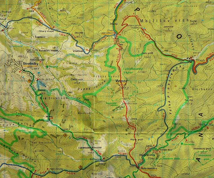 Prechádzame okolo záhadného prístroja, zapichnutého medzi stromami na lúke, kto vie čo to je? Za sprievodu trojhlasného štekotu obchádzame prázdny košiar, postavený strategicky priamo na ceste v strede pasienkov, zdravíme tuláka - samotára a upozorňujeme ho na hríb, čo ho čaká na stole pri útulni. Napájame sa na modrú značku do sedla Jasenová, po ľavej ruke nám pózuje Ľubietovský Vepor. Do sedla sme ale nedošli, lebo sme akosi stratili modrú značku a miesto nej o chvíľu našli červenú, po ktorej sme aj tak chceli pokračovať – nevedomky sme si o kúsok skrátili cestu a asi sme neboli prví, lebo tou „skratkou“ bola pekne prešliapaná zvážnica, viditeľnejšia ako odbočka do sedla.Výstup na Vepor je skoro celý lesom bez výhľadov, zato parádne graduje – čím vyššie, tým strmšie.