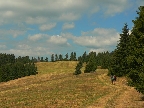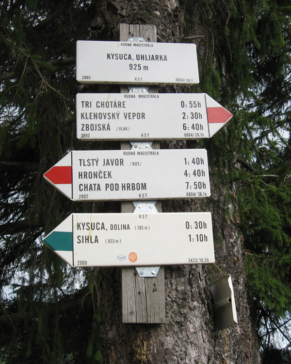 Ideme červenou Rudnou magistrálou. Kúsok po pasienkoch, okolo kravína na Uhliarke, ale potom už väčšinou lesom. Huby rastú ako po daždi, dubáky a plávky nám z ihličia mávajú. Mierne stúpajúcou zvážnicou v lese (zas tie maliny!) sa dostávame do sedla Tri chotáre, pokračujeme cez Šopisko striedavo lúkami a lesom. Chodník vedie po širokom hrebeni a popri ňom často vidieť hromady kameňov. Povyvážali ich sem asi gazdovia, ktorí dakedy dávno premieňali les na polia a pasienky. Dnes sa sem les znovu vracia.