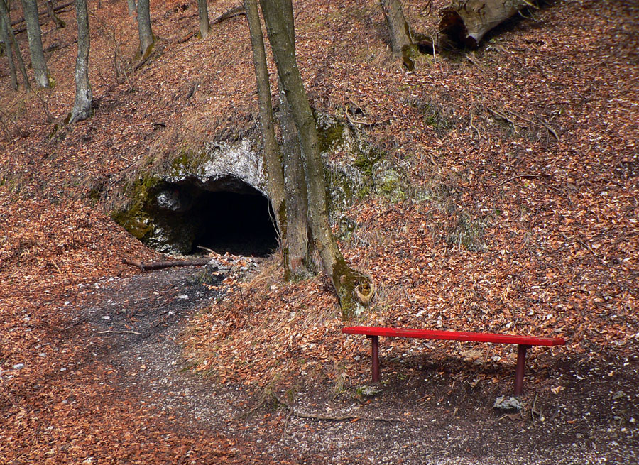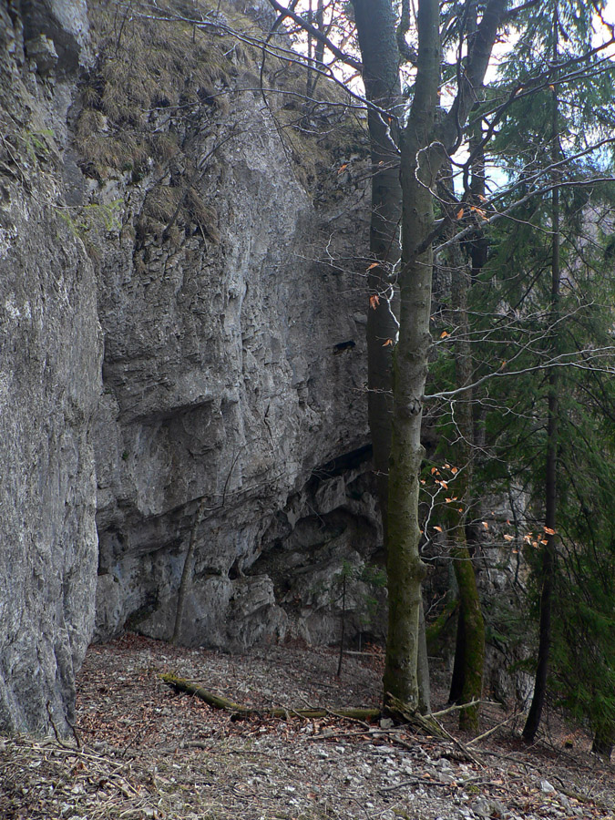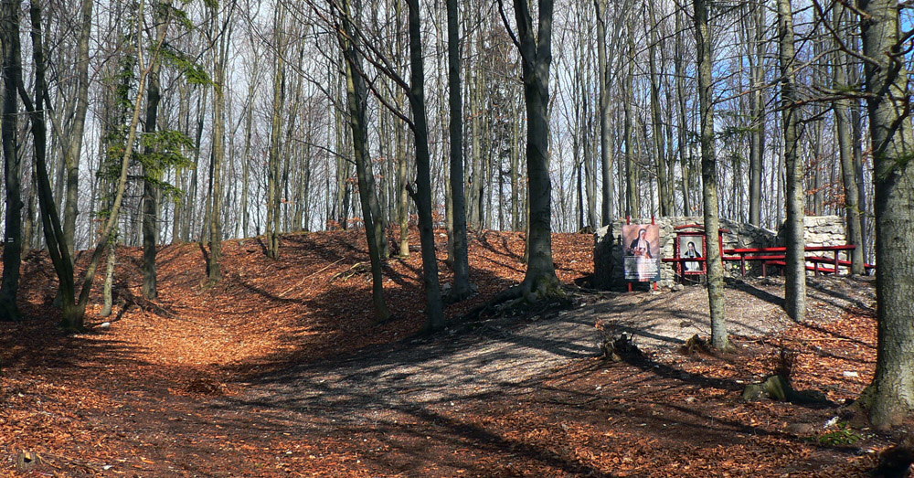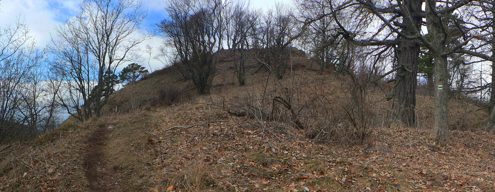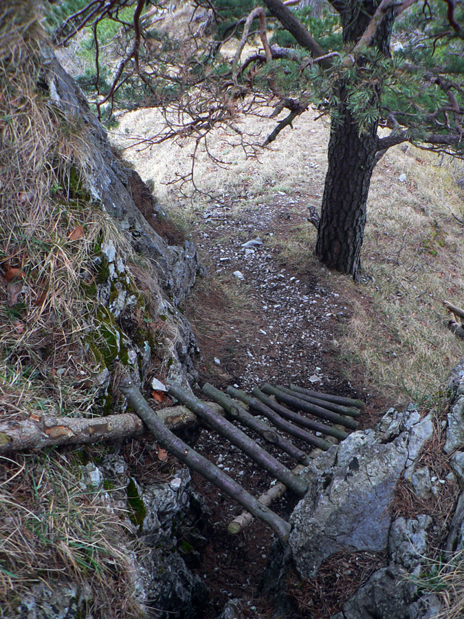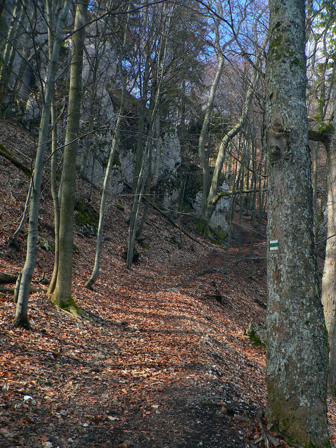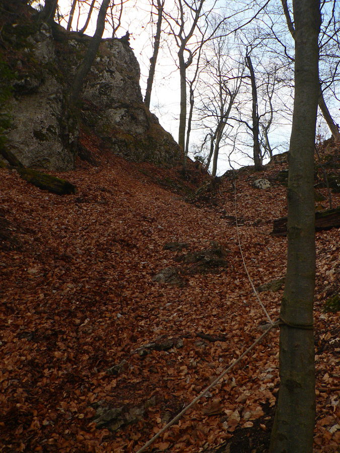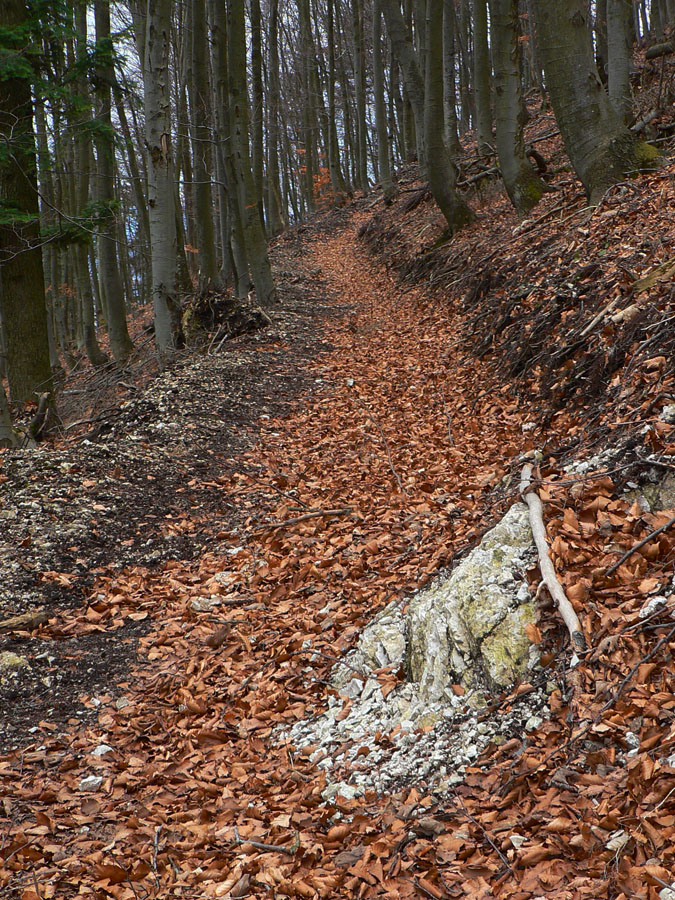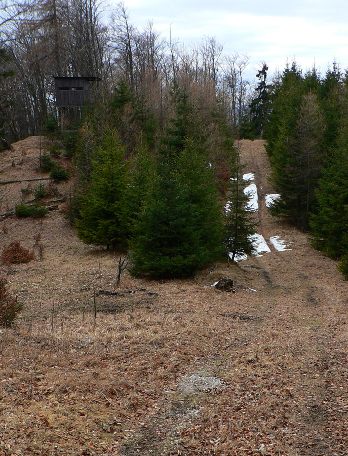 Z hradu dole po rebríku: kto nevie, nevidí ho, nenájde ho. Ale ja viem, že je tu poľovnícky náučný chodník. Značený bielo-zeleno, ale hrebienok nepustí, aj keď spočiatku je širší a chodník moc prechodený nie je. Zato do srnčích a jeleních oných je problém nestúpiť. A každú chvíľu to v lese zašuchoce.