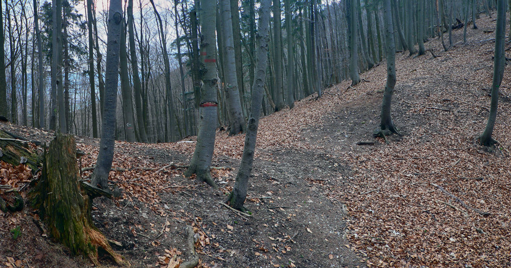 A ďalej už lesný, kopaný, traverzový chodník alebo rôzne typy lesných ciest, až na severný okraj veľkej lúky nad dedinou Brieštie, kde točím doľava. Odtiaľto až do Polerieky už len z kopca, zas po lesnej „diaľnici“, ako inak. Je tu aj cyklotrasa naznačená, ale ako vždy, preháňajú sa tu len zmrdi na motorkách, čo už s nimi?