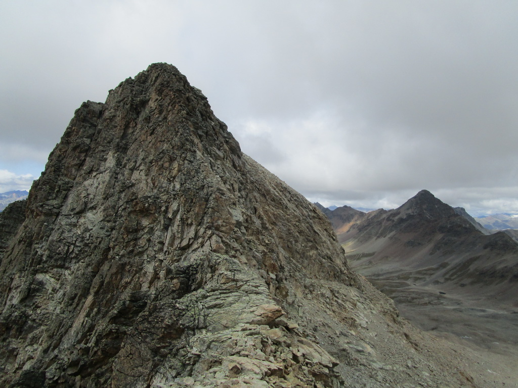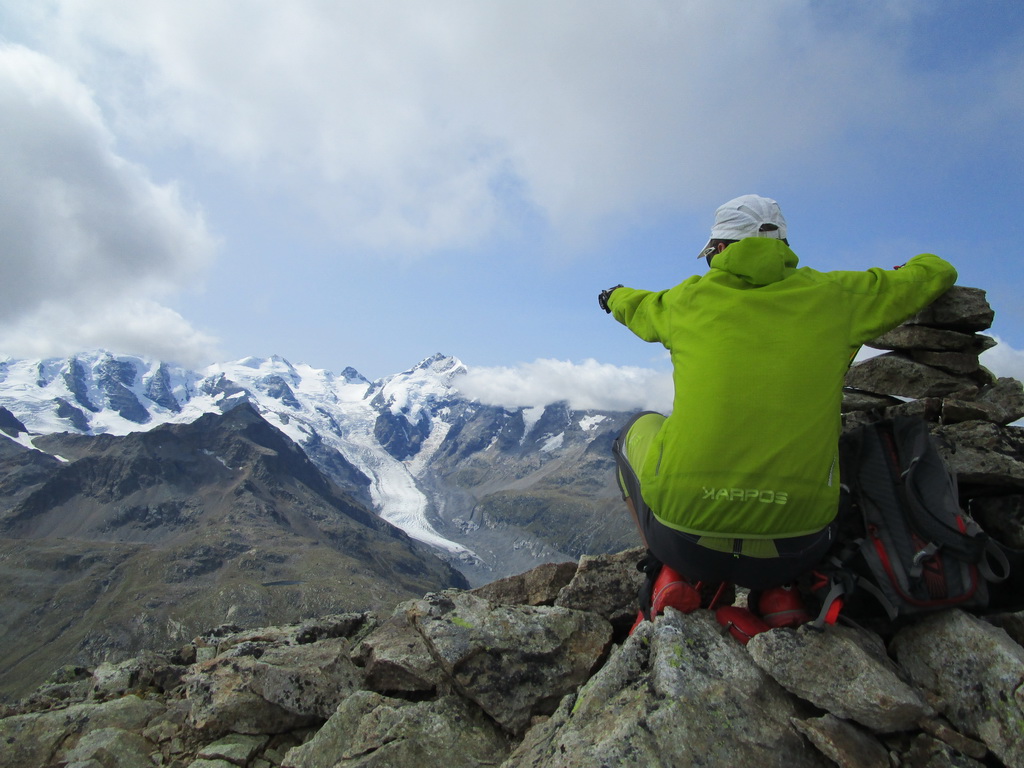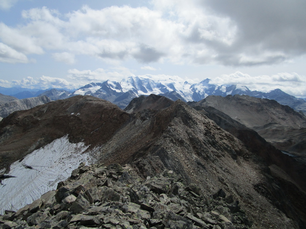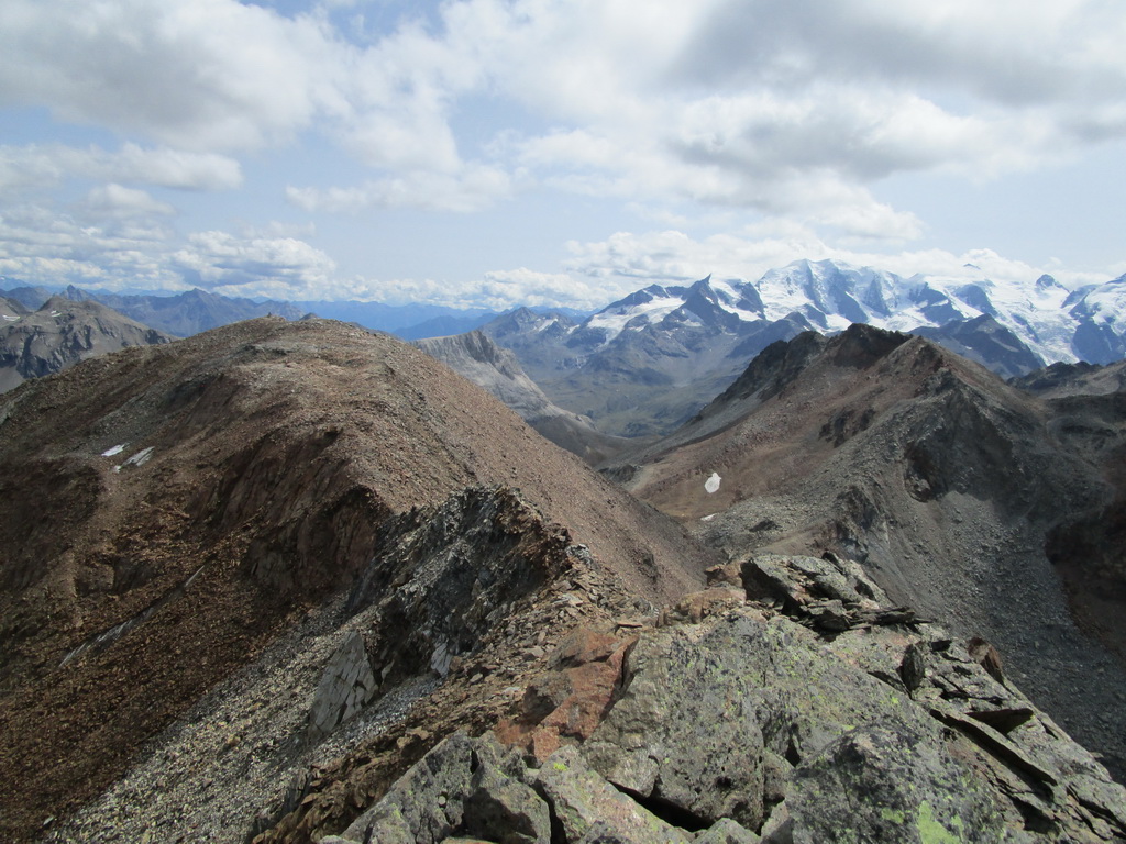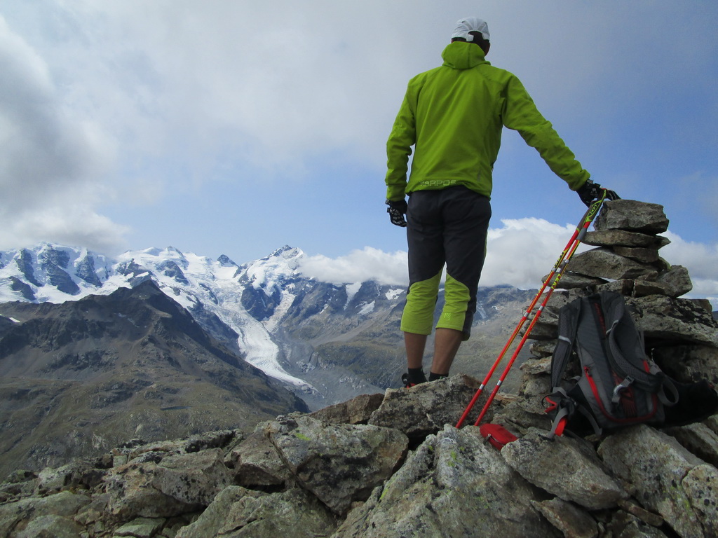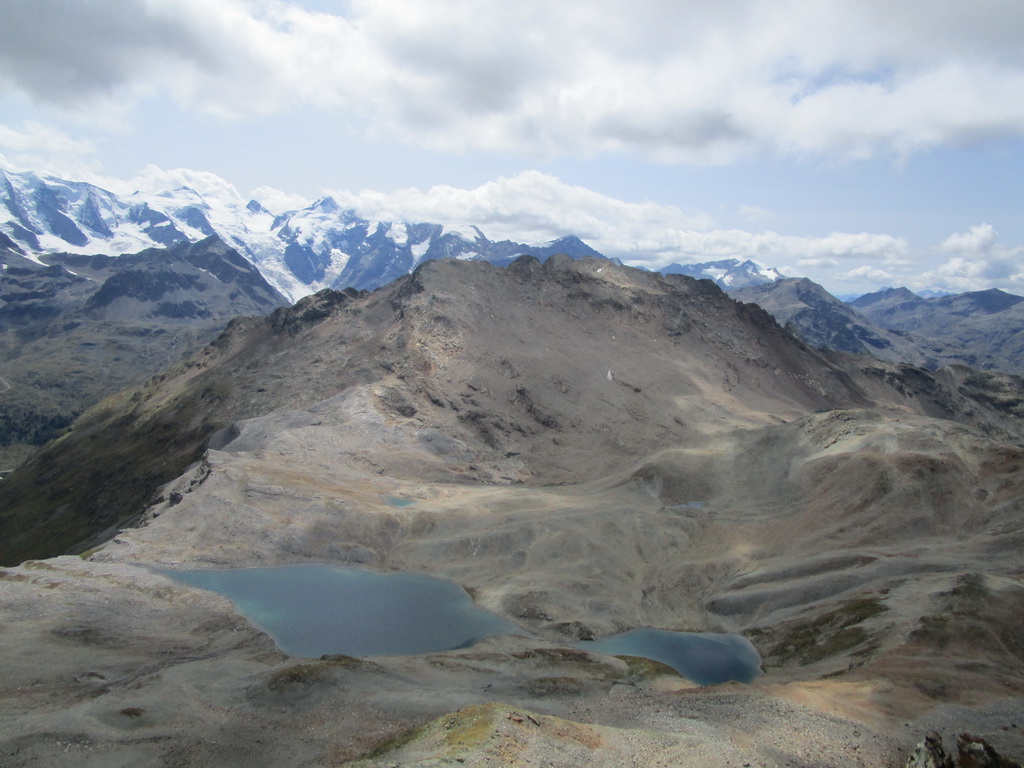 Po dosiahnutí hlavného vrcholu sa vraciam naspäť. Paličky som si nechal dole. Hlavný vrchol dnešného dňa mám za sebou. Tie výhľady na masív Berniny a ľadovec Morteratsch stáli za to. Aj som si trošku zaliezol... Ako tak zostupujem po suti dole, zahľadím sa na kopce oproti... Však čo s načatým dňom... Času je ešte dosť...