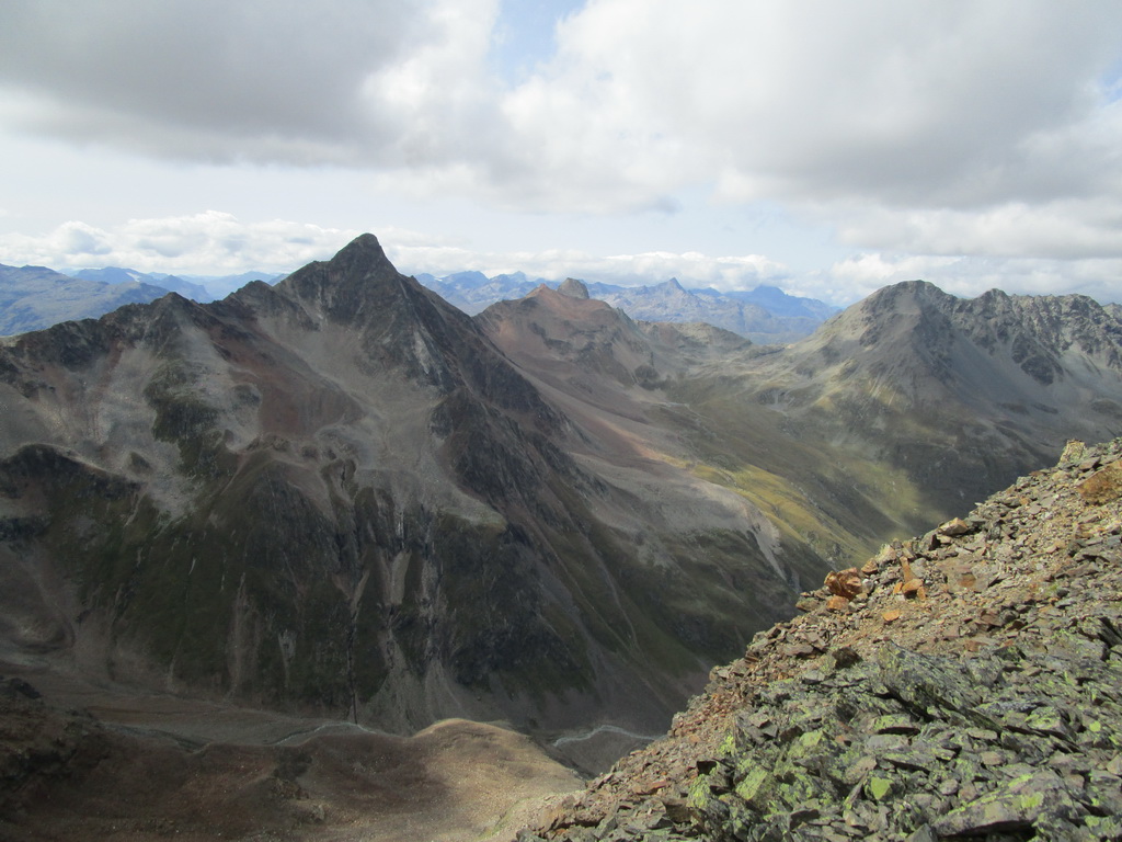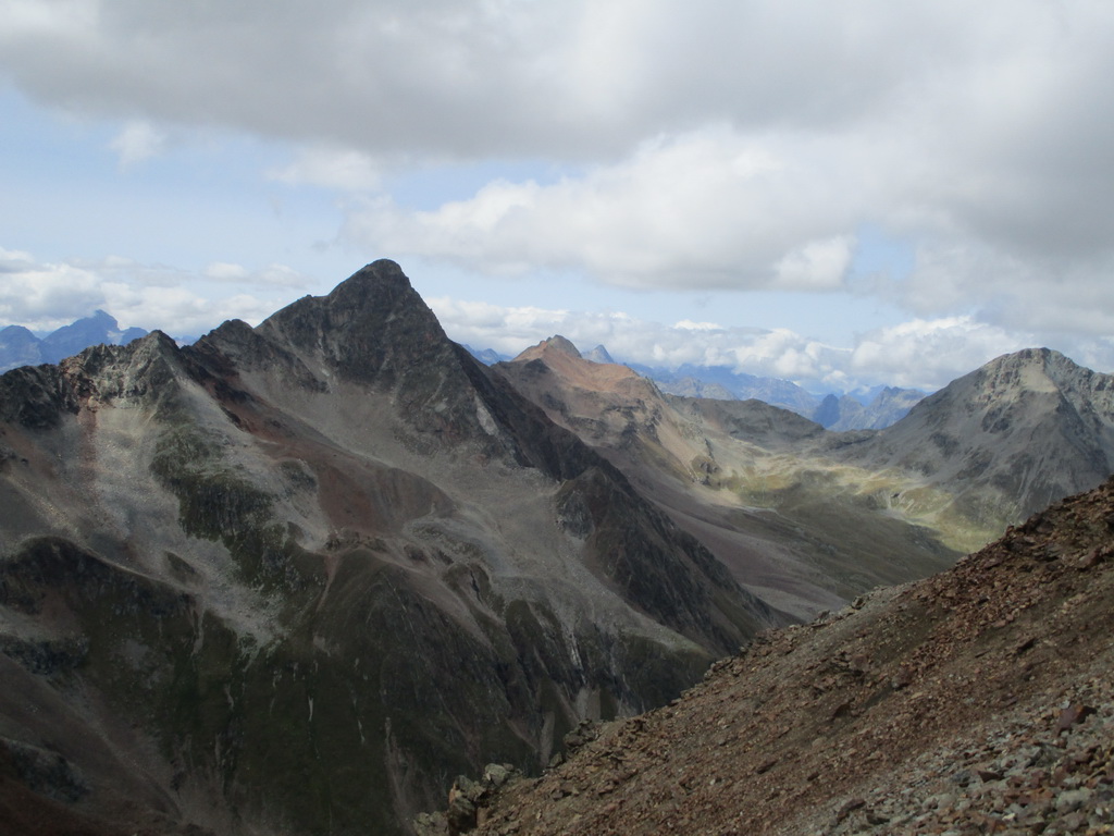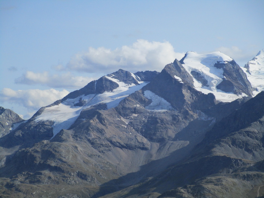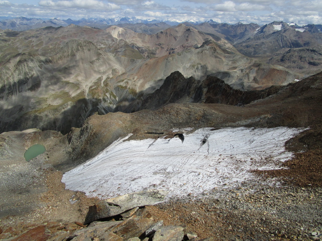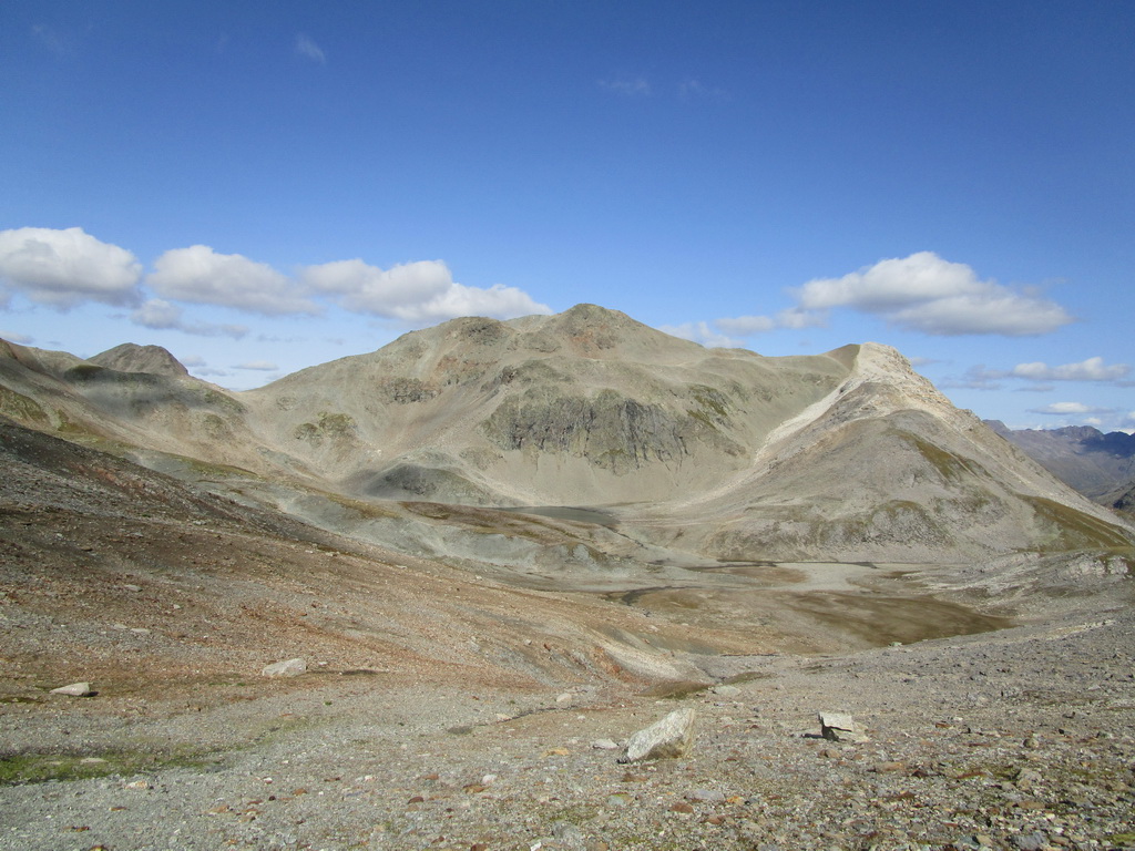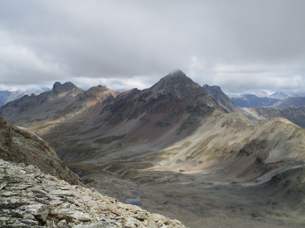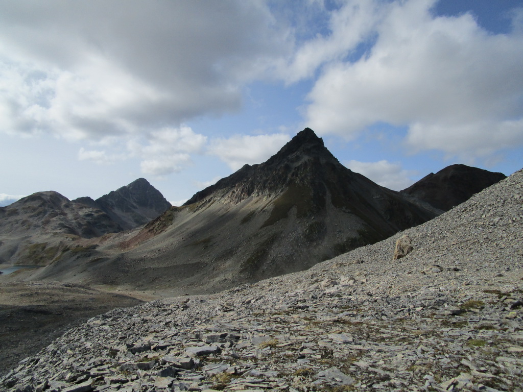 Po dosiahnutí hlavného vrcholu sa vraciam naspäť. Paličky som si nechal dole. Hlavný vrchol dnešného dňa mám za sebou. Tie výhľady na masív Berniny a ľadovec Morteratsch stáli za to. Aj som si trošku zaliezol... Ako tak zostupujem po suti dole, zahľadím sa na kopce oproti... Však čo s načatým dňom... Času je ešte dosť...