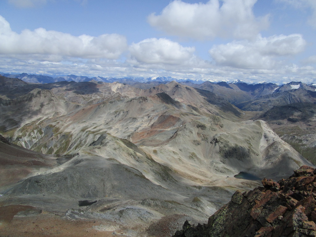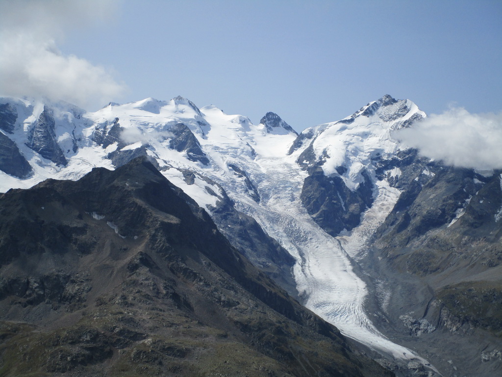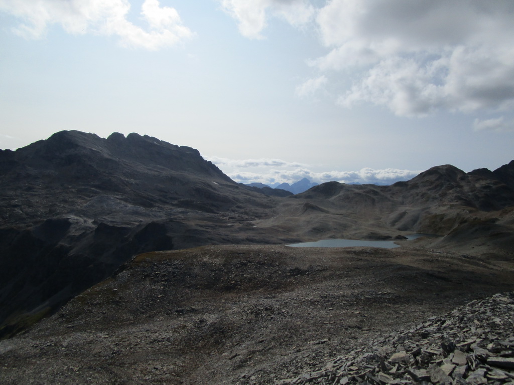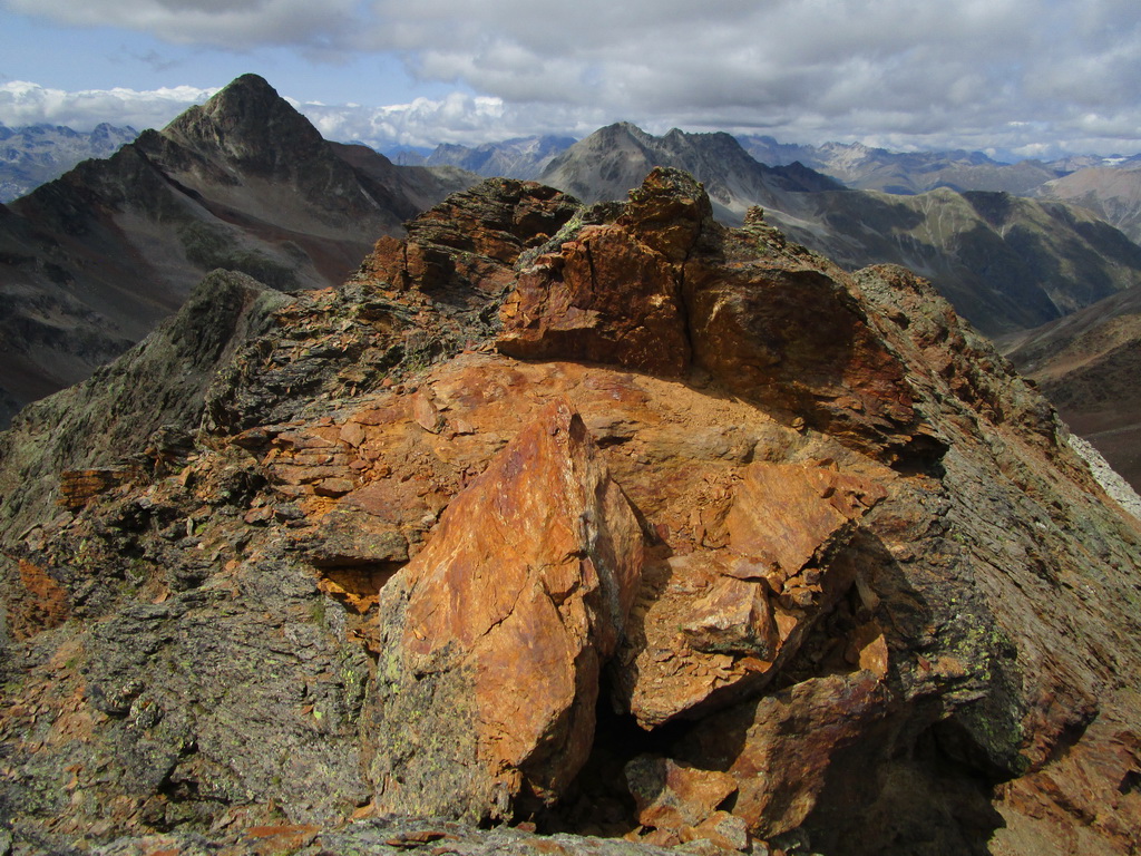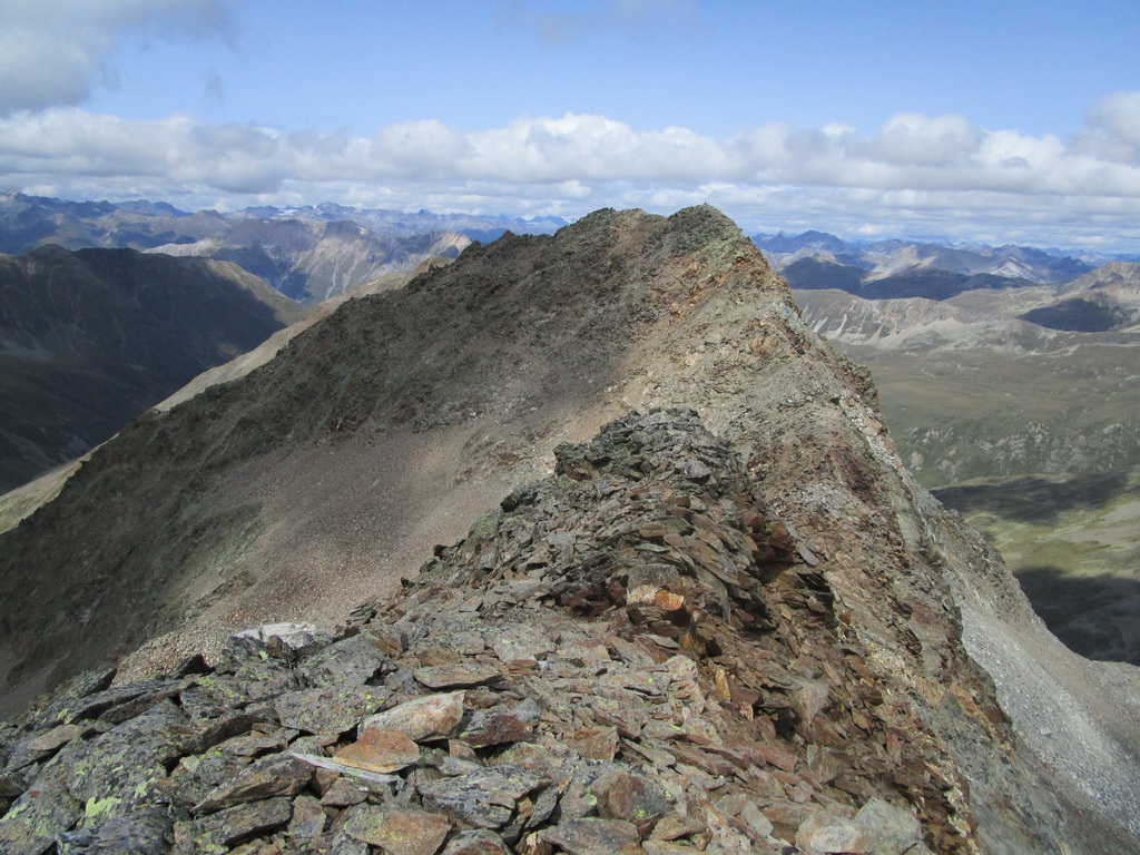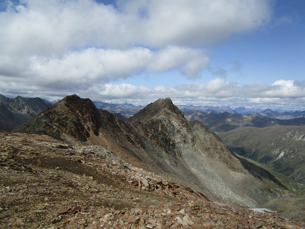 Po dosiahnutí hlavného vrcholu sa vraciam naspäť. Paličky som si nechal dole. Hlavný vrchol dnešného dňa mám za sebou. Tie výhľady na masív Berniny a ľadovec Morteratsch stáli za to. Aj som si trošku zaliezol... Ako tak zostupujem po suti dole, zahľadím sa na kopce oproti... Však čo s načatým dňom... Času je ešte dosť...