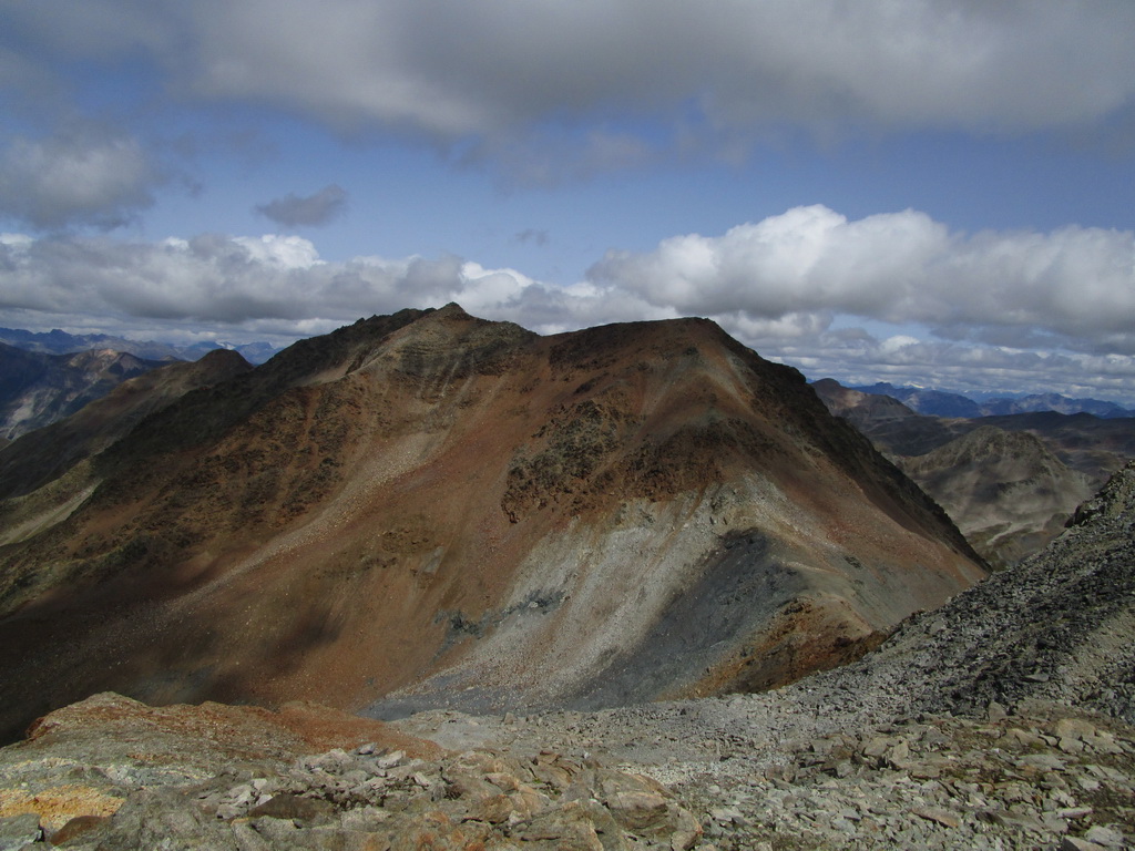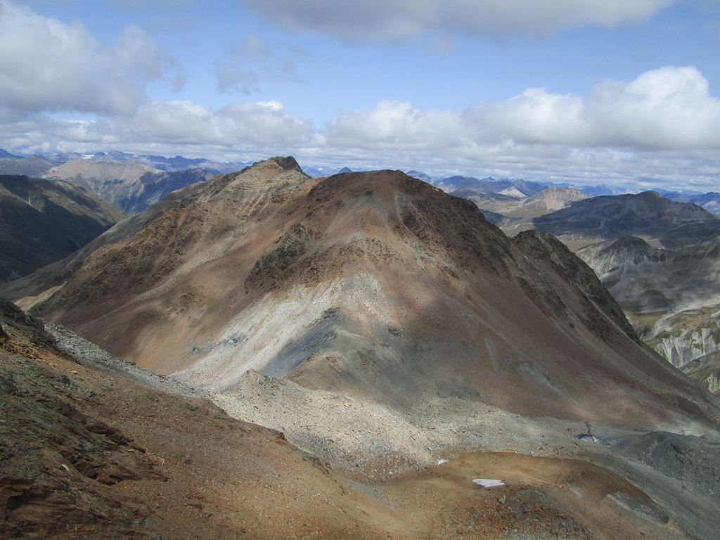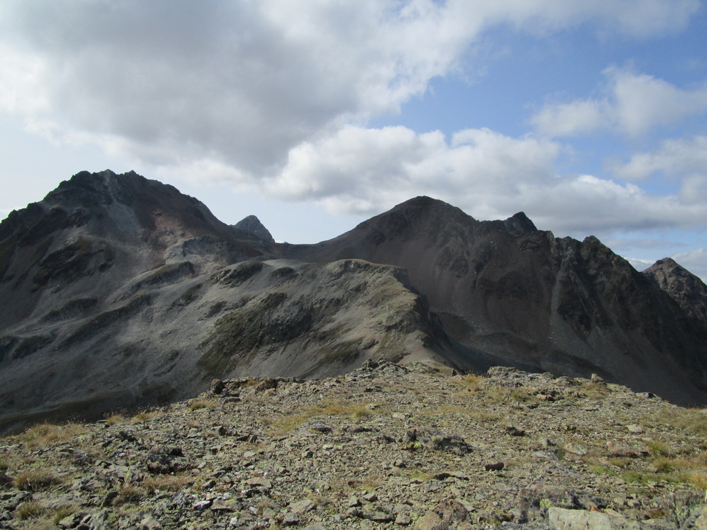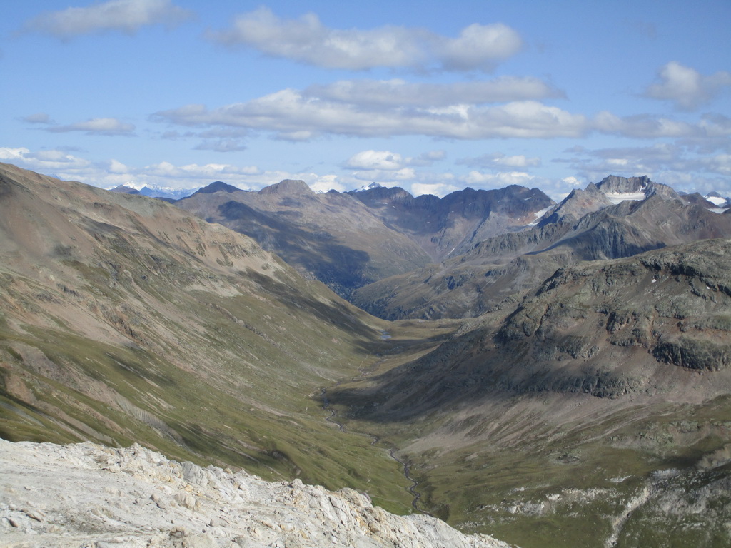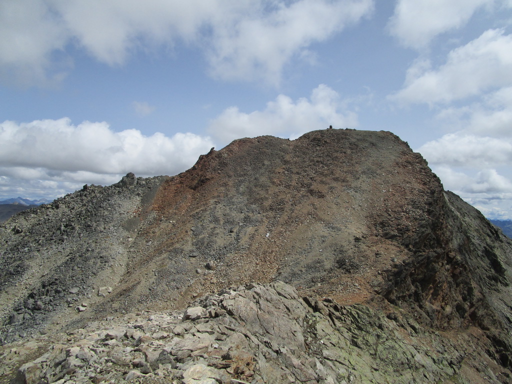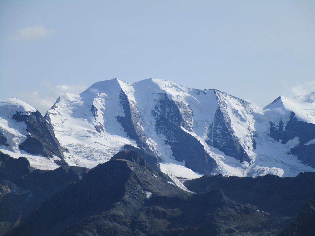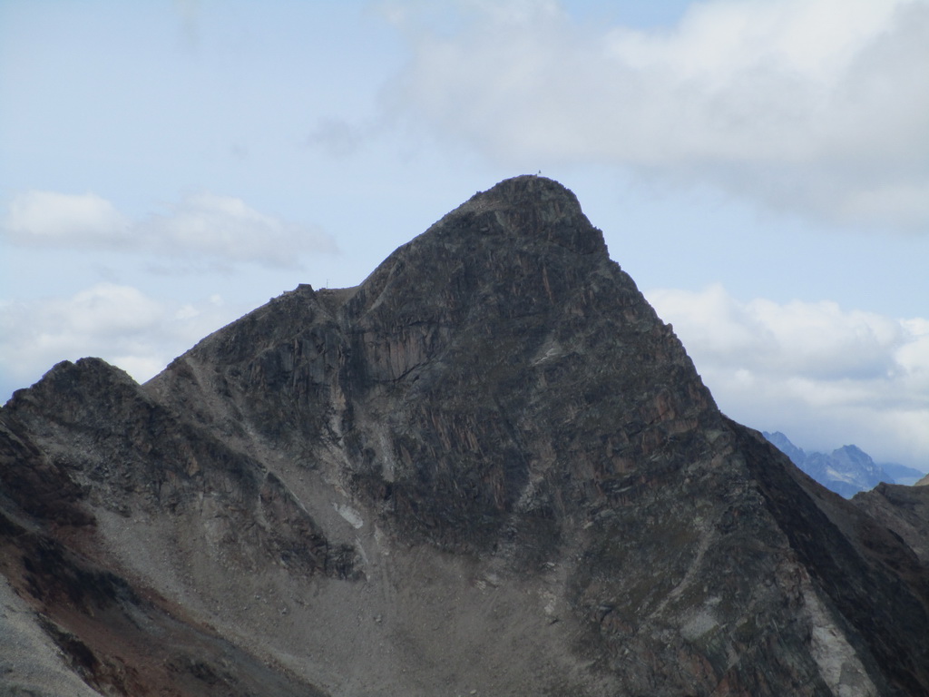 Po dosiahnutí hlavného vrcholu sa vraciam naspäť. Paličky som si nechal dole. Hlavný vrchol dnešného dňa mám za sebou. Tie výhľady na masív Berniny a ľadovec Morteratsch stáli za to. Aj som si trošku zaliezol... Ako tak zostupujem po suti dole, zahľadím sa na kopce oproti... Však čo s načatým dňom... Času je ešte dosť...