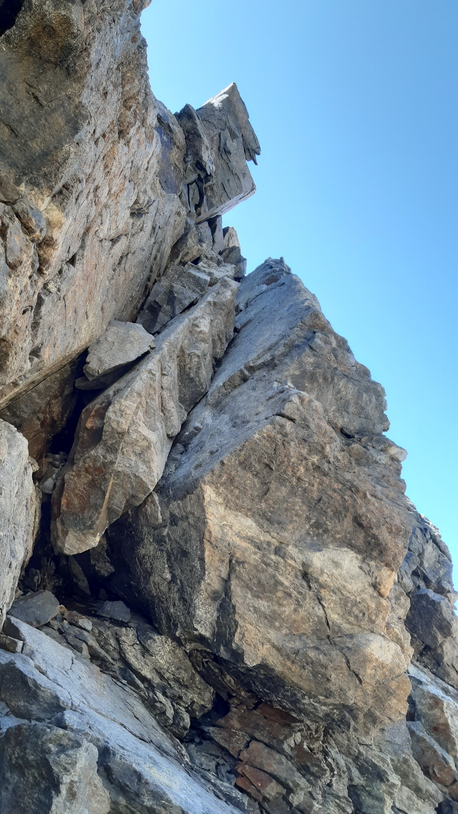 Samotný skalný hrebeň je momentálne úplne bez snehu a ľadu, čiže postupuje sa ním po suchej skale bez mačiek, až na jeho koniec. Pri mojom prieskume som v závere skalnej časti hrebeňa stretol vracajúceho sa chlapíka pôvodom z Iránu. Nemal lano ani sedačku, a napriek tomu sa pokúšal o výstup na Berninu. Ráno sa pichol do háku za ostatných lezcov a tí ho potom niekde na začiatku ľadovcového hrebeňa otočili s radou, aby sám ďalej nepokračoval.