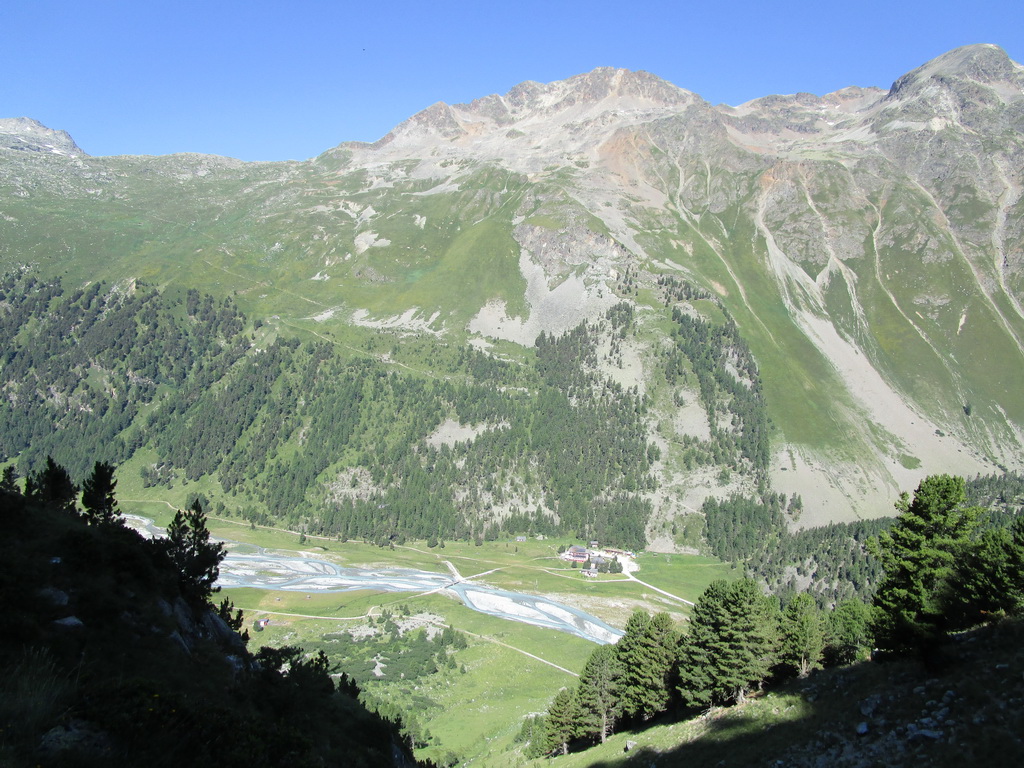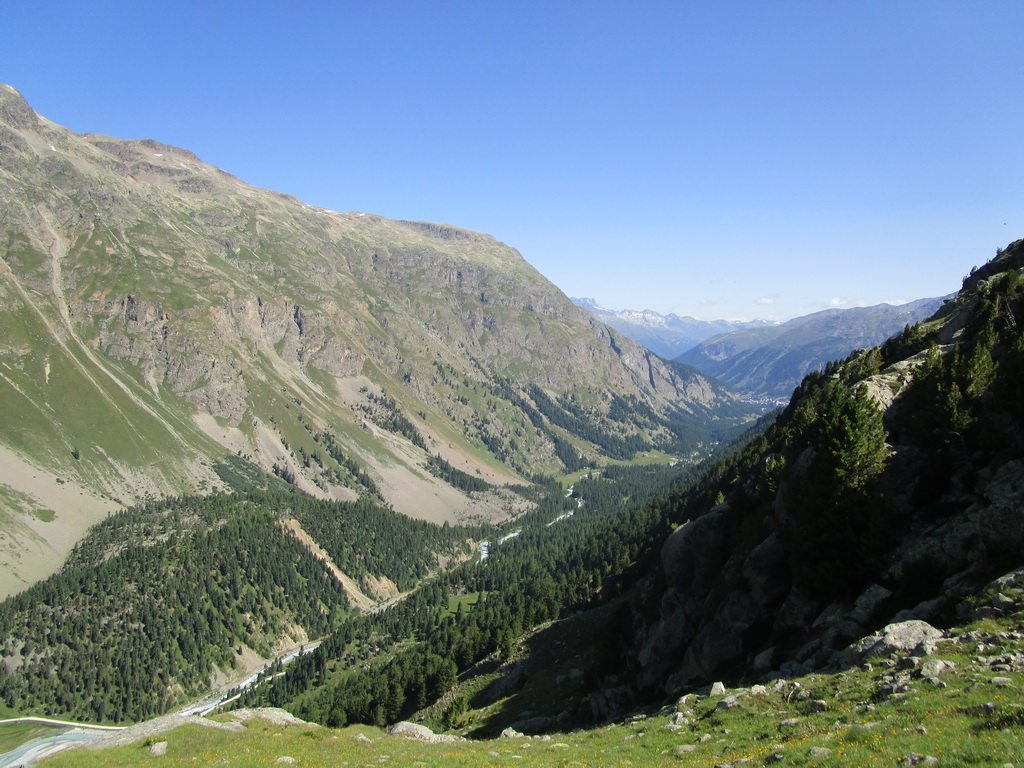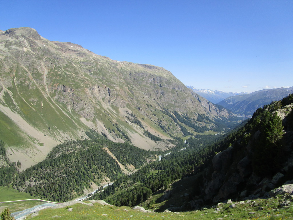 Vyrážam ráno od hotela Roseggletscher a s paličkami stúpam starým borovicovým lesom. Tam kam idem nevedú žiadne značkované chodníky, dnes sa budem pohybovať len po chodníčkoch divokej zveri. Využívajúc hojne vyšliapanú sieť chodníčkov, dostávam sa nad hranicu lesa. Otvárajú sa mi úžasné výhľady, tie ma dnes budú sprevádzať celý deň.