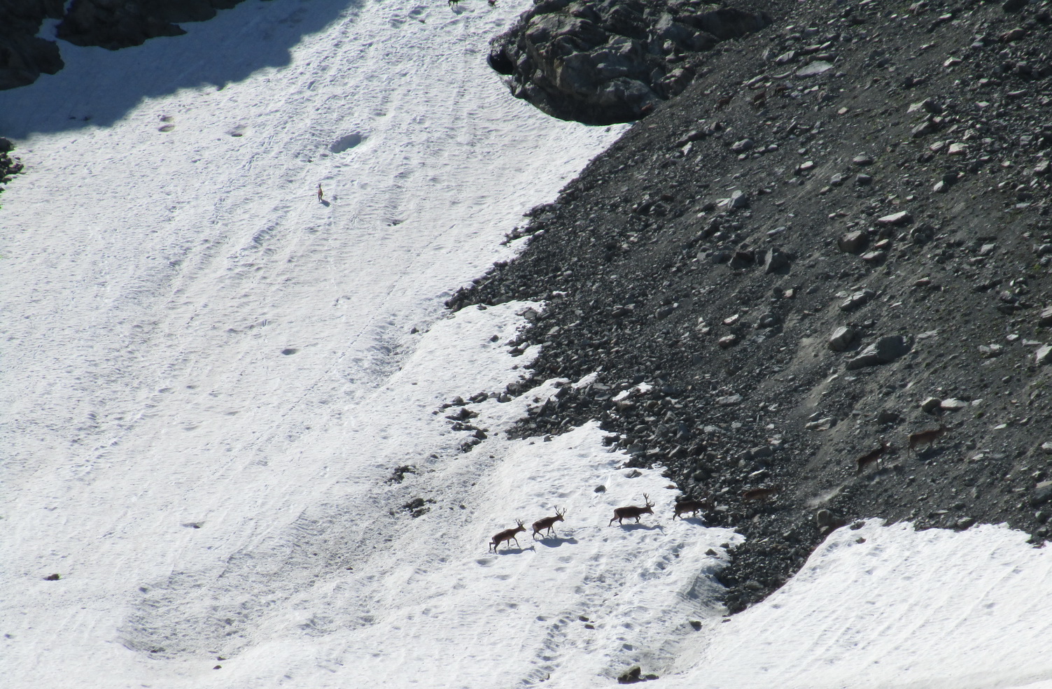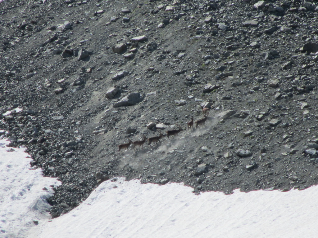 Nad hranicou lesa stúpam hore šikmou rampou, ktorú v zime občas použijú skialpinisti na zjazd do doliny. Zver si tu tiež vyšliapala široký chodník. Vyplašil som tu kamzičiu rodinku s mladými, utekajú strmým svahom dole. Kamzíci si udržujú väčší odstup ako u nás v Tatrách. Pravidelne sa tu na nich totiž poľuje, poľovný revír začína hneď na druhej strane doliny.