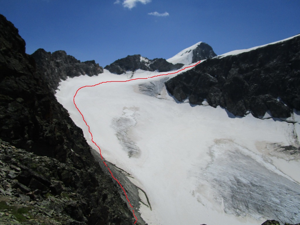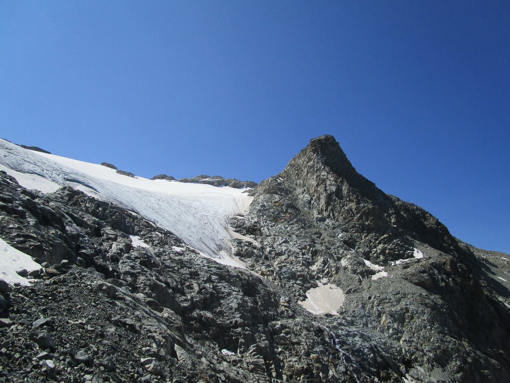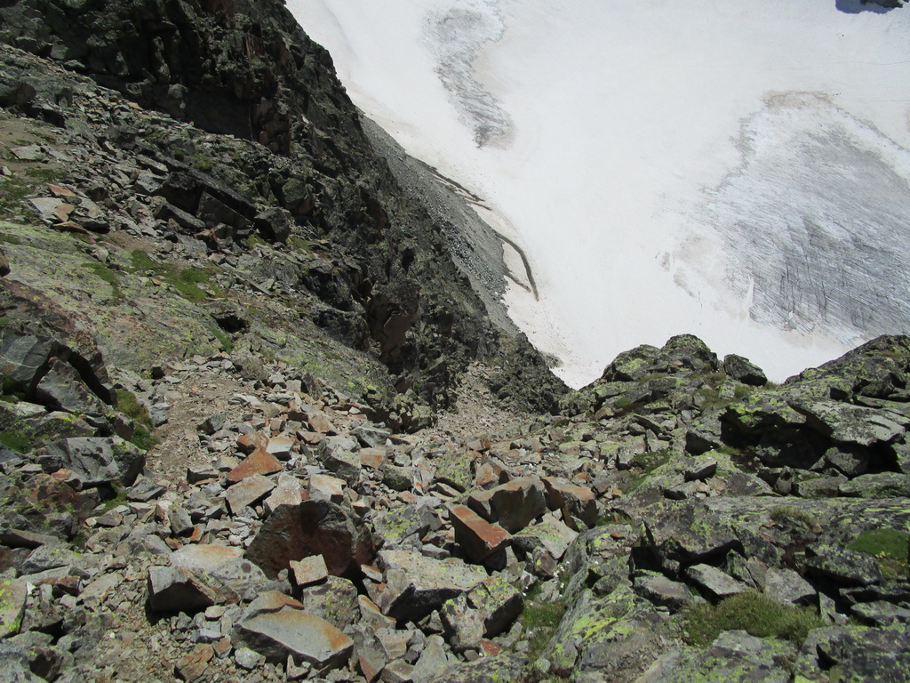 Nebudem sa naspäť vracať tou istou trasou. Pri nedávnych dvoch výstupoch na susedný Piz Tschierva som si vytipoval okruh cez ľadovec. Na ľadovec Misaun, nachádzajúci sa v doline medzi Misaunom a Tschiervou, zostupujem rampou s uzučkým chodníčkom. Občas treba zliezť nejakú stienku, ale je to v pohode. Dole ešte trošku šachovania po pohyblivej suti, a už znovu nasadzujem mačky na tenisky. Tie sa dnes veľmi osvedčili.