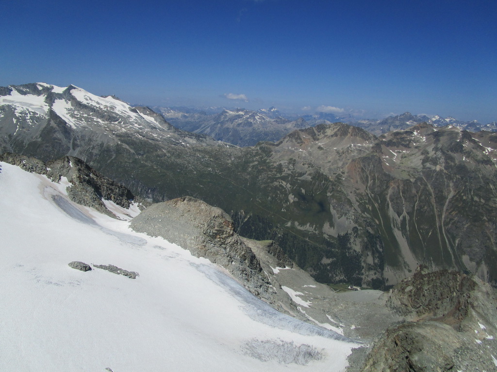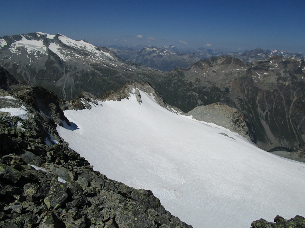 Ľadovec Misaun je väčší ako susedný menší braček, a tak sa tu rysujú aj nejaké tie trhlinky. Postup po ňom je však rýchly a pohodlný. Netrvá dlho a prehupnem sa cez východné rebro, kadiaľ vedie normálka na Piz Tschierva a odtiaľ, vychutnávajúc si výhľady na Piz Morteratsch, zbehnem po známej trase na chatu Tschierva. Až tu stretávam dnes prvých ľudí...