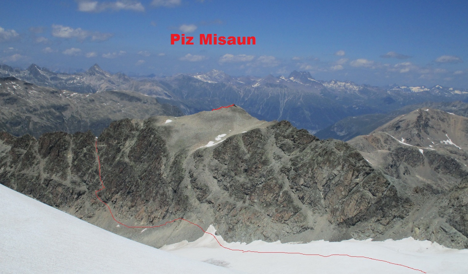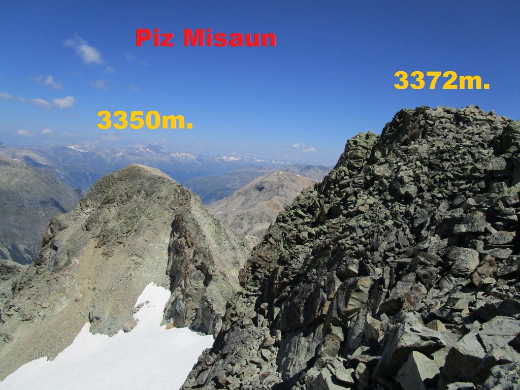 Vystupujem hore po ľavej strane potoka tečúceho z ľadovčeka Misaun. Občas preliezam ľahké skalné platne a mierim k ľadovcu. Tu pozorujem aj skupinku jeleňov. Vegetácia pomaly končí a začína suťovisko s množstvom voľných kameňov. Prichádzam k ľadovcu a vyberám špeciálne mačky na tenisky. Dnes ich testujem prvý raz. Prechádzam po ľadovci bez trhlín, mačky sa veľmi osvedčili a s pomocou nich a čakana postupne vystupujem na predvrchol a neskôr aj na hlavný vrchol Piz Misaun. Vládne tu divočina, trasu si vyberám sám, na ľadovci bolo zopár starých stôp a pod hlavným vrcholom som dokonca našiel nový zlaňák, ja som to miesto však musel vyliezť aj zliezť bez lana. Množstvo voľných kameňov tu predstavuje najväčší problém.