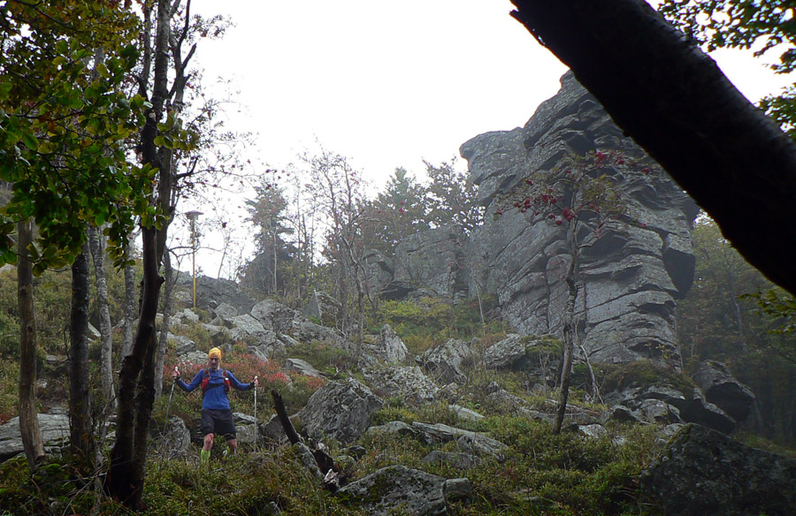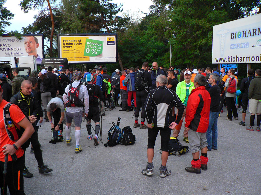 Ale prišla sobota, 21. september, ráno ideálne chladné na "rýchlejšiu turistiku", len trochu vlhkejšie. Mraky sa prevaľovali, sem tam slnko vykuklo. Aj spŕchlo pred štartom a hore na hrebeni keď zafúkalo, z mokrých stromov pršalo druhý raz. V kalendári skoro rovnodennosť, takže kto chcel prísť za vidna (asi do 19:00), musel zlomiť traťový rekord. Takých kandidátov sa na štartovke nazbieralo dosť - minimálne prvé dve dvojice z tohoročnej "nadzvukovej" Stíhačky. A čakalo sa, čo predvedú neznáme zahraničné mená.