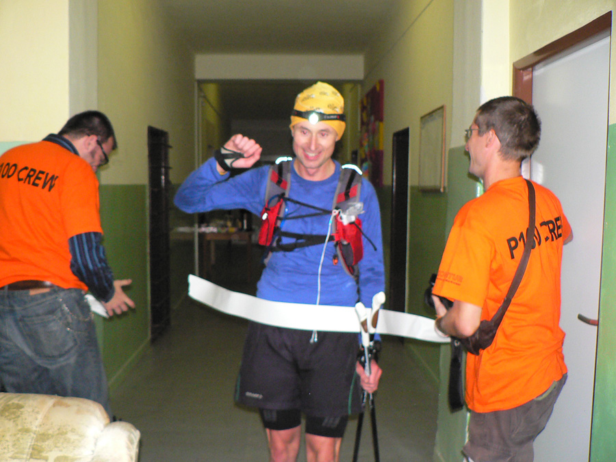 Prvá trojka dorazila do cieľa ešte za vidna a všetci rýchlejšie ako vlaňajší víťaz, aj takéto postupné posúvanie limitov je obraz progresu terénnych ultrabehov v posledných rokoch na Slovensku. Lenže potom hodinová diera a netrpezlivé čakanie, kedy dorazia ďalší, veď už by tu mali byť - lenže dorazili mestskí policajti! A vraj čo blbneme, veď pod Gričom prebieha poľovačka!!! A či organizátori behu nahlásili akciu úradom a také tie policajné oné... Našťastie len trochu planého poplachu, poľovníkom sa hádam podarilo vysvetliť, že diviaky sú síce podobne zaprasené a aj smrdia ako bežci po 100km, ale nemajú čelovky :-) Žiadna zabijácka rojnica v lese sa nekonala, len sa trochu mulatovalo na poľovníckej chate, že?