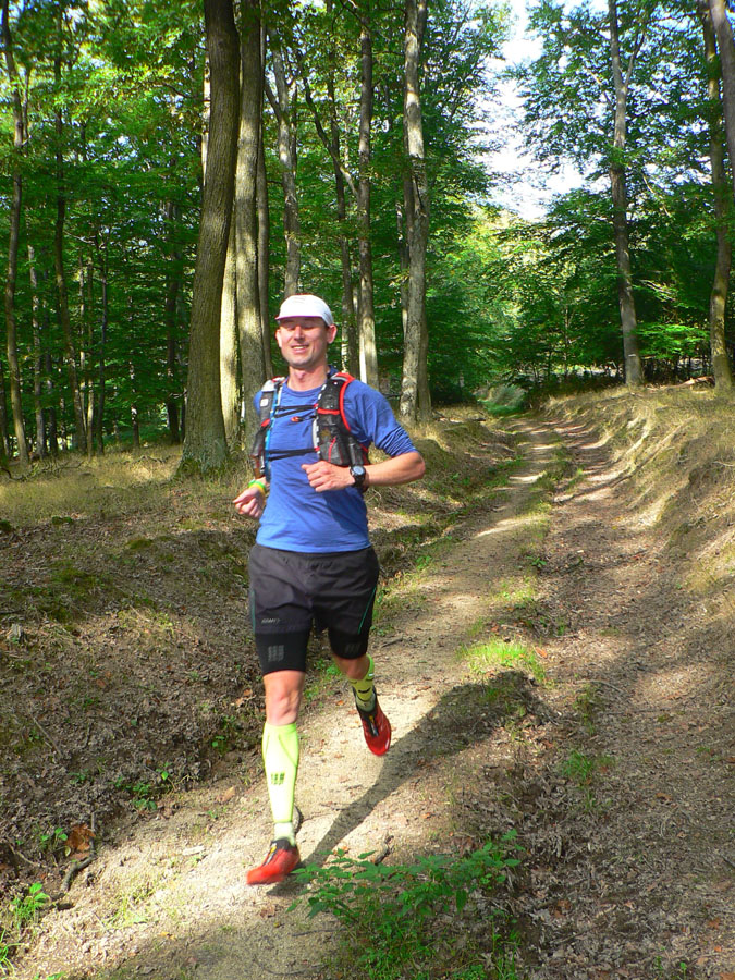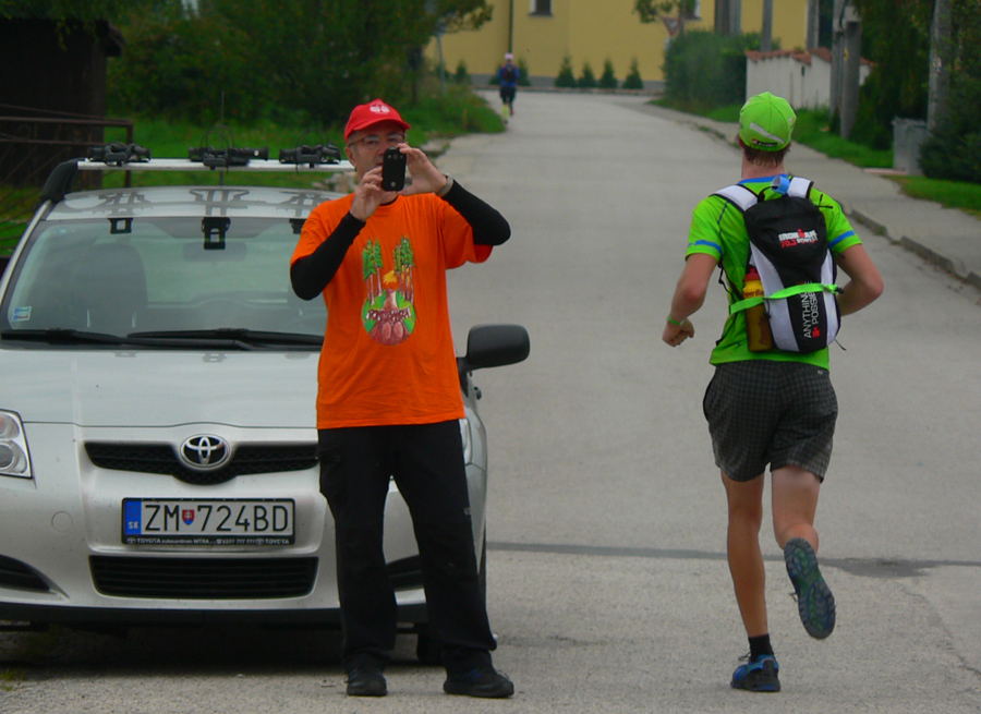 Veľké Pole - Jarabá skala: Ja sa na tento úsek naopak vždy teším - konečne budem vyššie, bude lepší vzduch, príjemne mäkko pod nohami, ožívam. Tak aj teraz. Dopujem sa pre istotu chémiou, aby sa ľahšie stúpalo na Rúbaný vrch, odkiaľ sa už dobre beží. Aj mi to celkom v tej dnešnej mizérii ide, keď zrazu sa okolo mňa preženie lokomotíva Tomáš Bizoň. Keď ja idem na Šlehu, čo si dal on??? Pod Tríbečom vyzeral biedne. Tiež opustil parťáka, ktorého vraj zradil žalúdok, a ide ako píla. O chvíľu ma ale predbieha zas: nejaký debil tam musel prehodiť fáborky náročky do zlého smeru! Uverili viacerí, Ivan Mudroň tak asi prišiel o striebro. V cieli padla myšlienka, že to bol možno krčmár zdola z dediny, aby získal klientov :-)