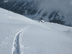 Všade sú haldy snehu. Prichádzam na úroveň chaty. Nechce sa mi prešlapávať stopu traverzom k chate, aj tak je zavretá. Rozhodujem sa, že vyšliapem ešte kúsok hore a otáčam sa. Brodím sa hlbokým snehom a sklon svahu už určite nie je tých max. 35 stupňov, čo som si sľúbil dnes neprekročiť...