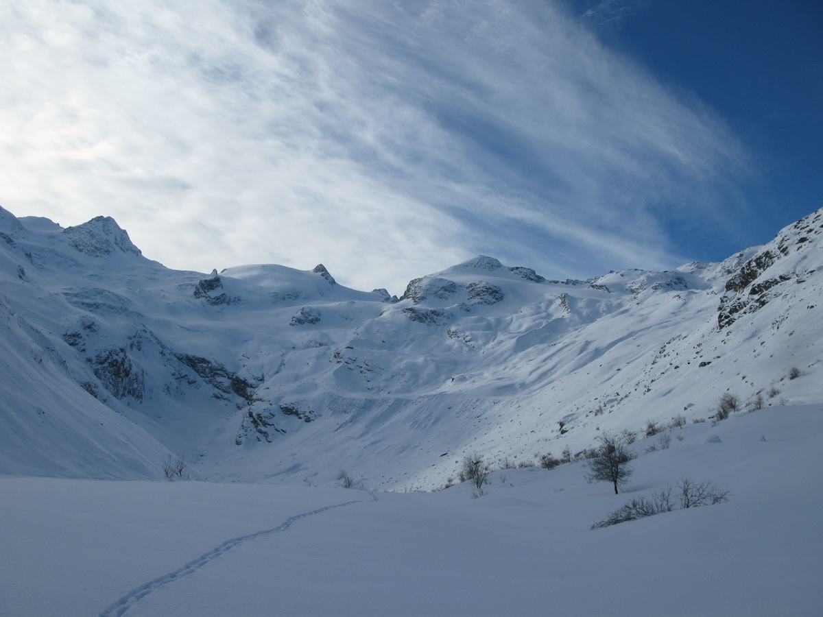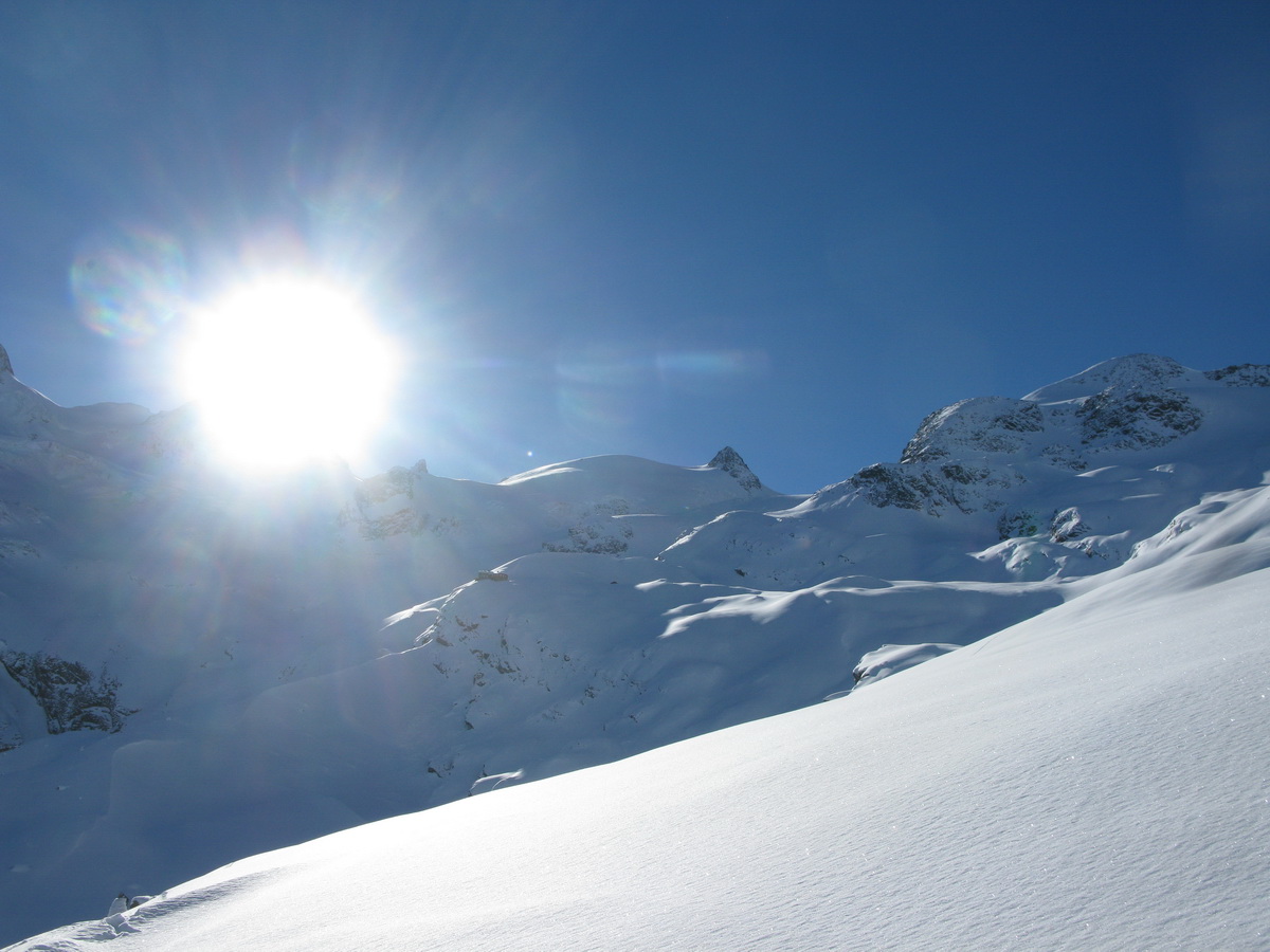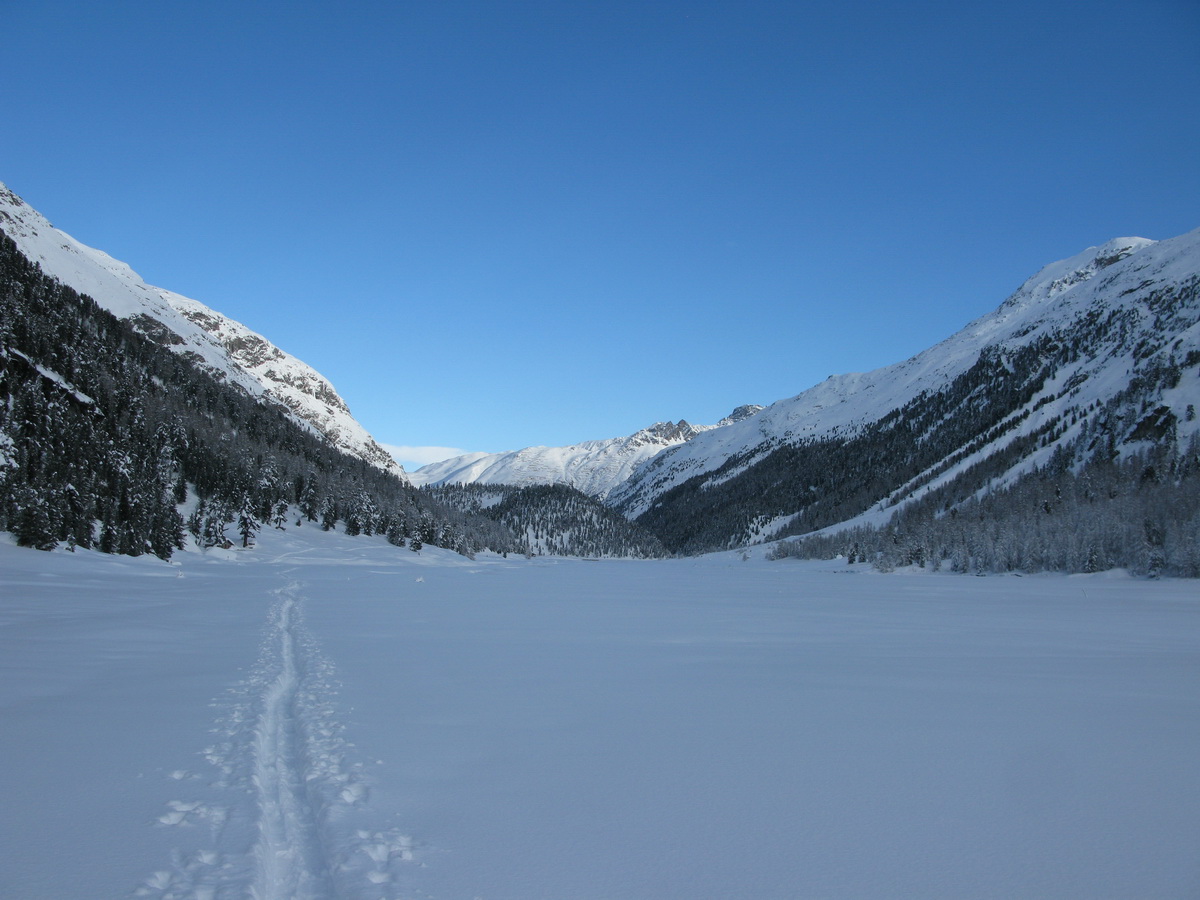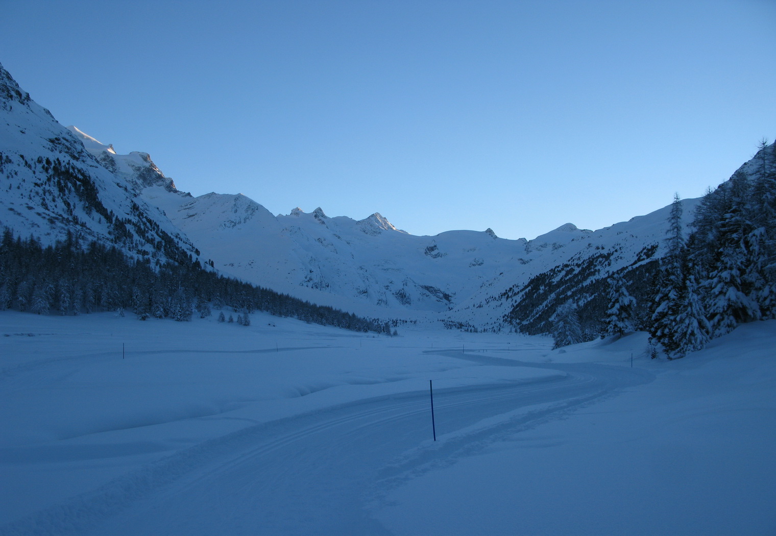 Vyrážam od Hotela Roseggletscher (2000m.) po bežeckej stope, ktorá po chvíľke končí. Teraz prichádza rad na nové ľahké špeciály do prašanu (šírka 93mm). Brodím sa snehom a rozmýšľam, kam by som sa vybral. Možnosť ísť na chatu Tschierva a pokúsiť sa ísť smerom na rovnomenný kopec zakrátko zavrhujem. Dostať sa cez potok by bol problém. A tak prichádza na rad druhý variant. Skúsim sa prebrodiť na chatu Coaz.