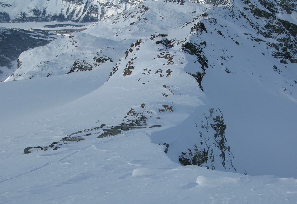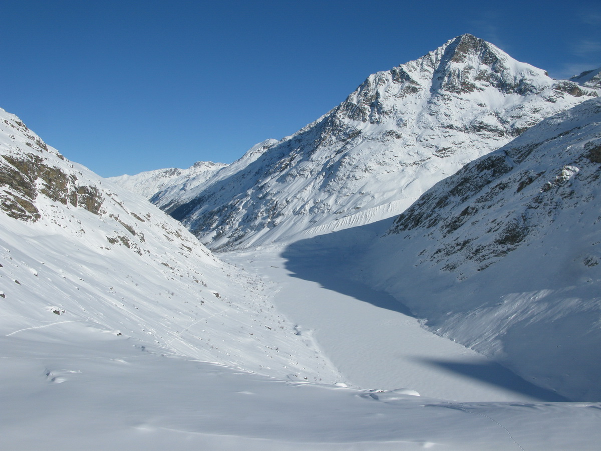 Po výdatnom snežení a po včerajšom oťukávaní terénu v okolí Julierpassu vyrážam na prieskum doliny Val Roseg. Je mi jasné, že tu nebude žiadna stopa a ani nikoho nestretnem. Na dnes je pre túto oblasť vyhlásená lavínová trojka. Sneh však celkom dobre drží a nevidno veľa samovoľných lavín ani splazov.