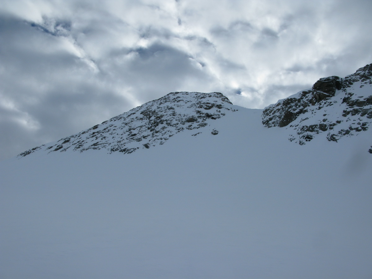 A vyrážam smer vrchol. Rizikové miesta mám už predsa za sebou, tak idem hore. Posledný strmý svah nehodnotím ako rizikový, čo malo spadnúť je už dole a doskočisko je krásne veľké. Trošku práce mi ešte dá prekopať sa cez okrajový prevej, a potom už nasleduje ľahký mixový terén na vrchol bez lyží.
